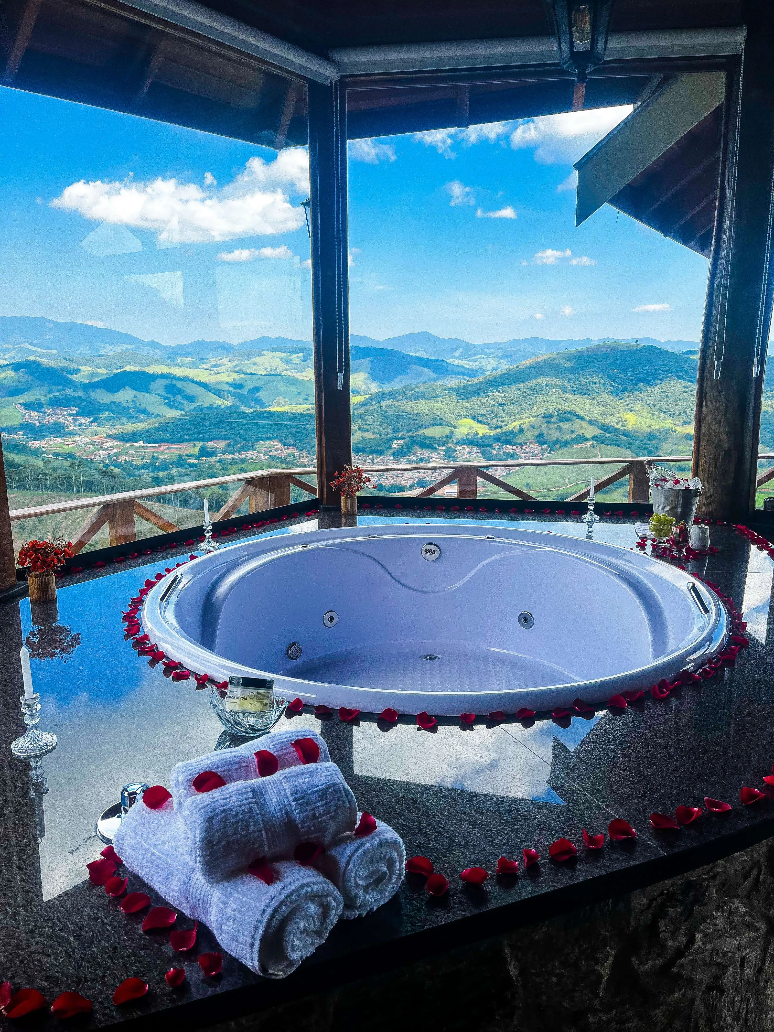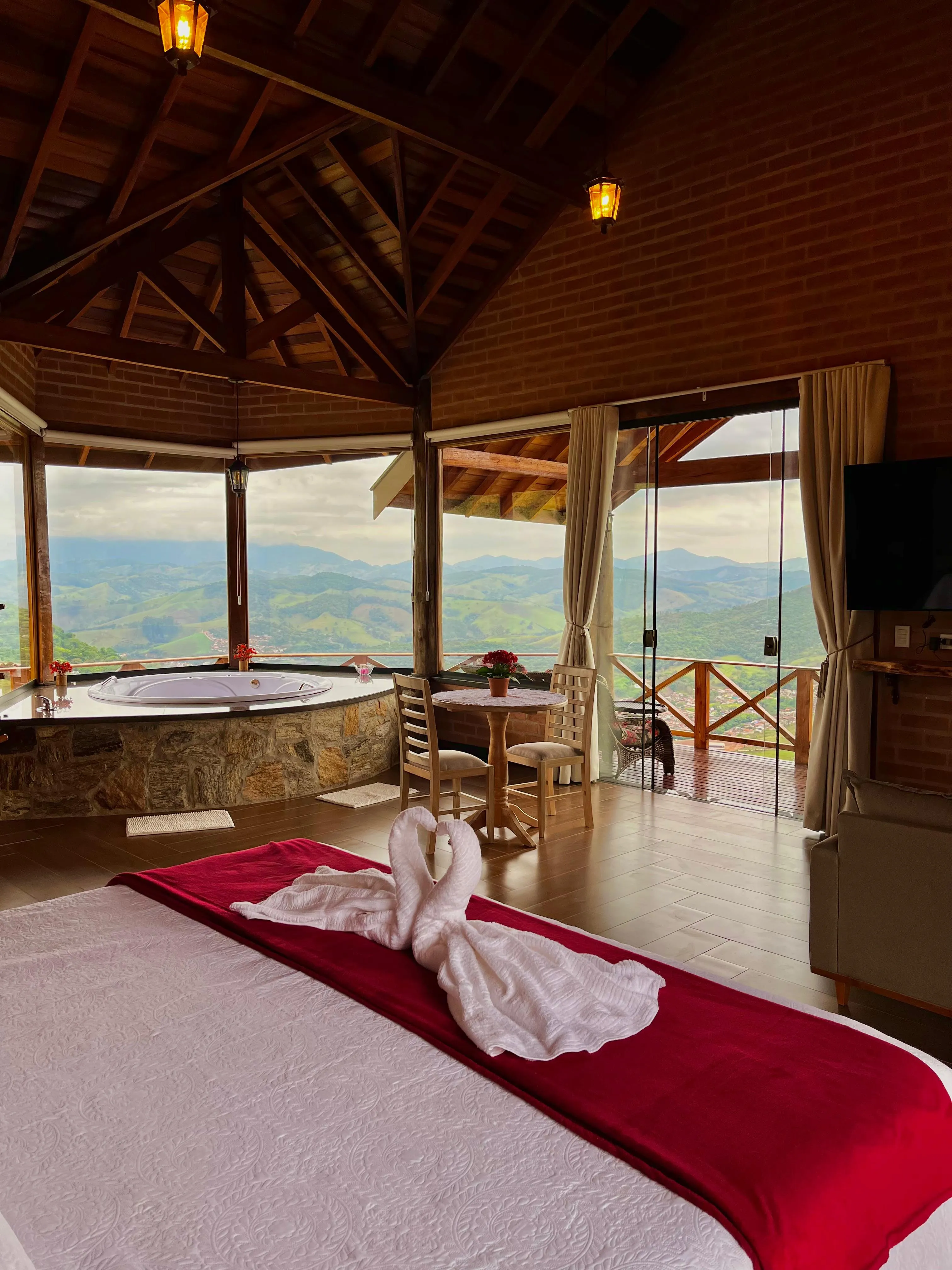O chalé está equipado com todos os itens essenciais para a estadia, tais como: um quarto com cama King-size, TV de 60 polegadas, lareira, mesa de refeição, banheira de hidromassagem rodeada por vidros e vista para as montanhas. Uma cozinha completa (fogão, frigobar, sanduicheira, jogo de panelas, talheres, pratos, porta vinho/taças), um banheiro com duas duchas, sanitário, bidê e lavatório, e um deck com vista panorâmica, espreguiçadeira e mesa de refeição.