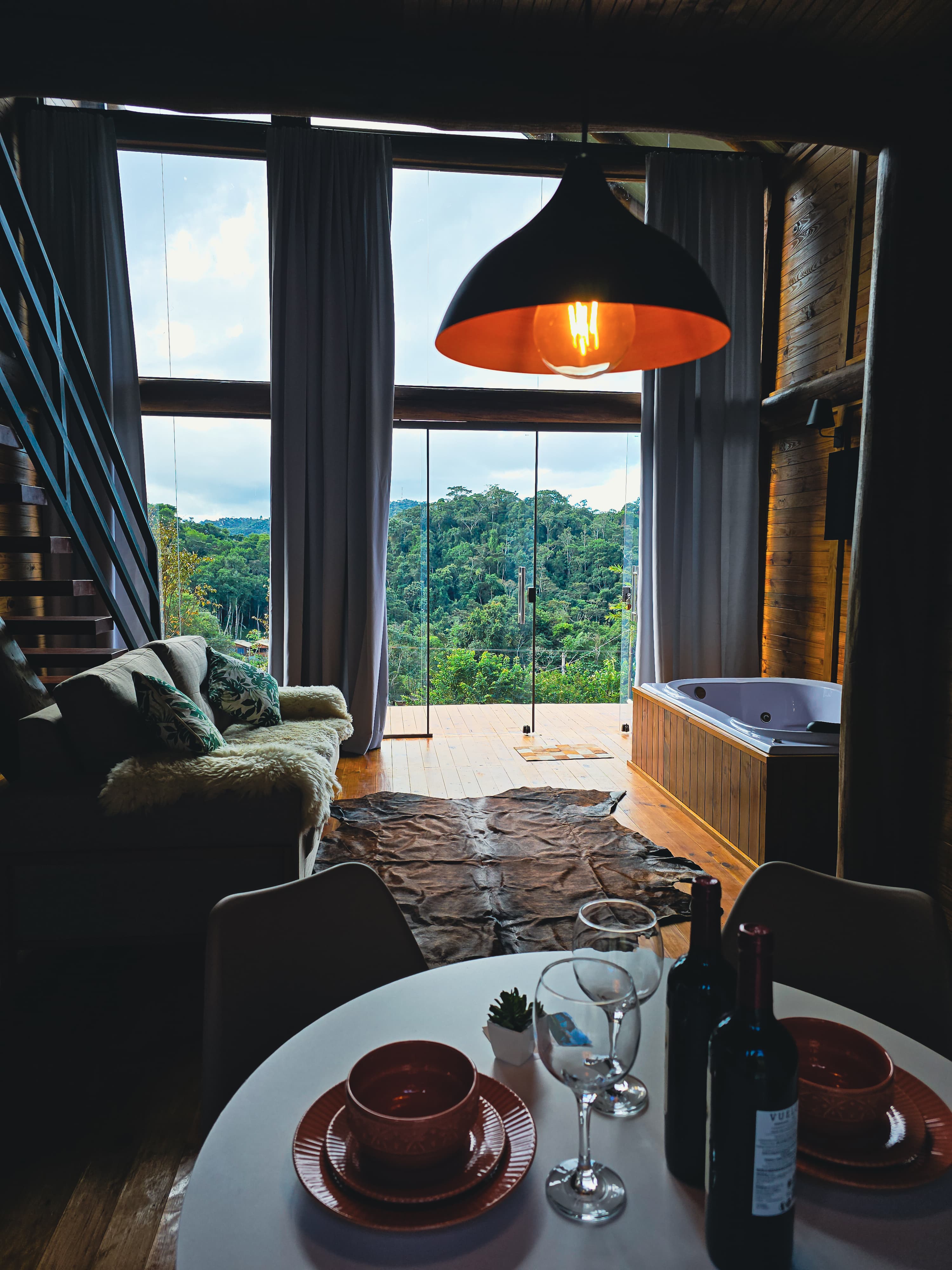 Com vista para as montanhas, os chalés estilo cabana oferecem uma estadia acolhedora, ideal para casais que valorizam privacidade, conforto e contato com a natureza. Cada unidade conta com cozinha completa com utensílio. Jacuzzi, criando o ambiente perfeito para relaxar em silêncio absoluto.
