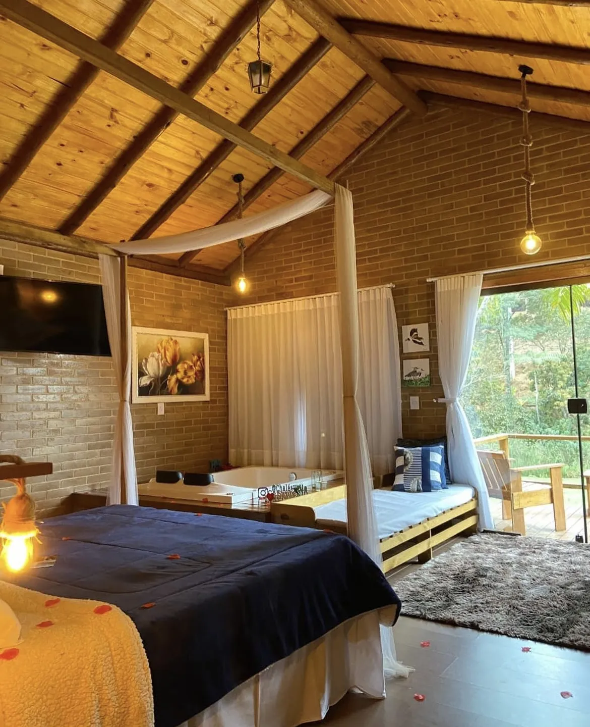 Ar condicionado Secador de cabelo TV a cabo / Smart TV Jacuzzi / Ofurô / Banheira Coberta Frigobar Lareira Máquina de Café Enxoval de Luxo (+ Roupão e Pantufa) Sauna Cozinha Estação de trabalho (mesa e cadeira) Piscina Aquecida ou climatizada Borda Infinita Coberta