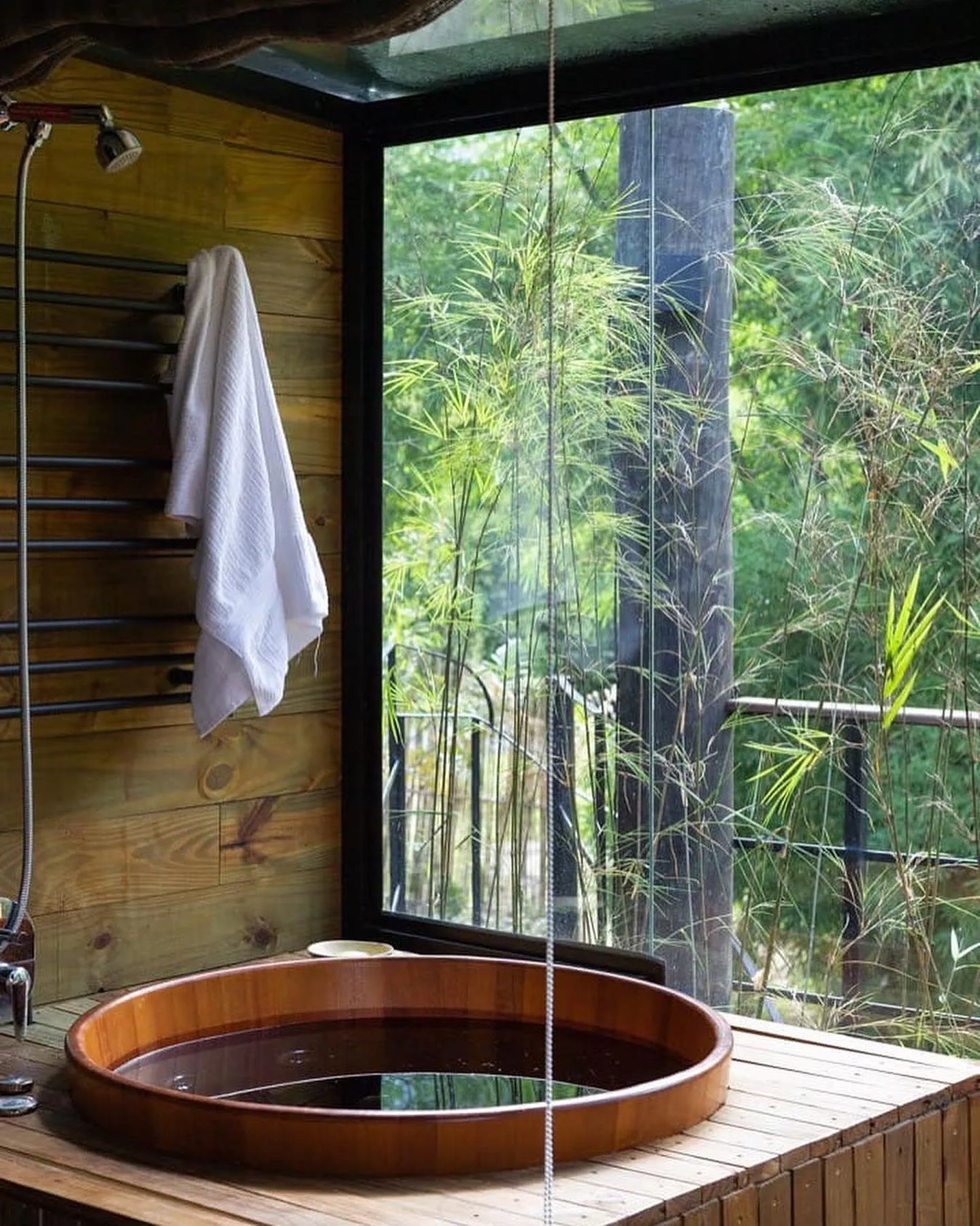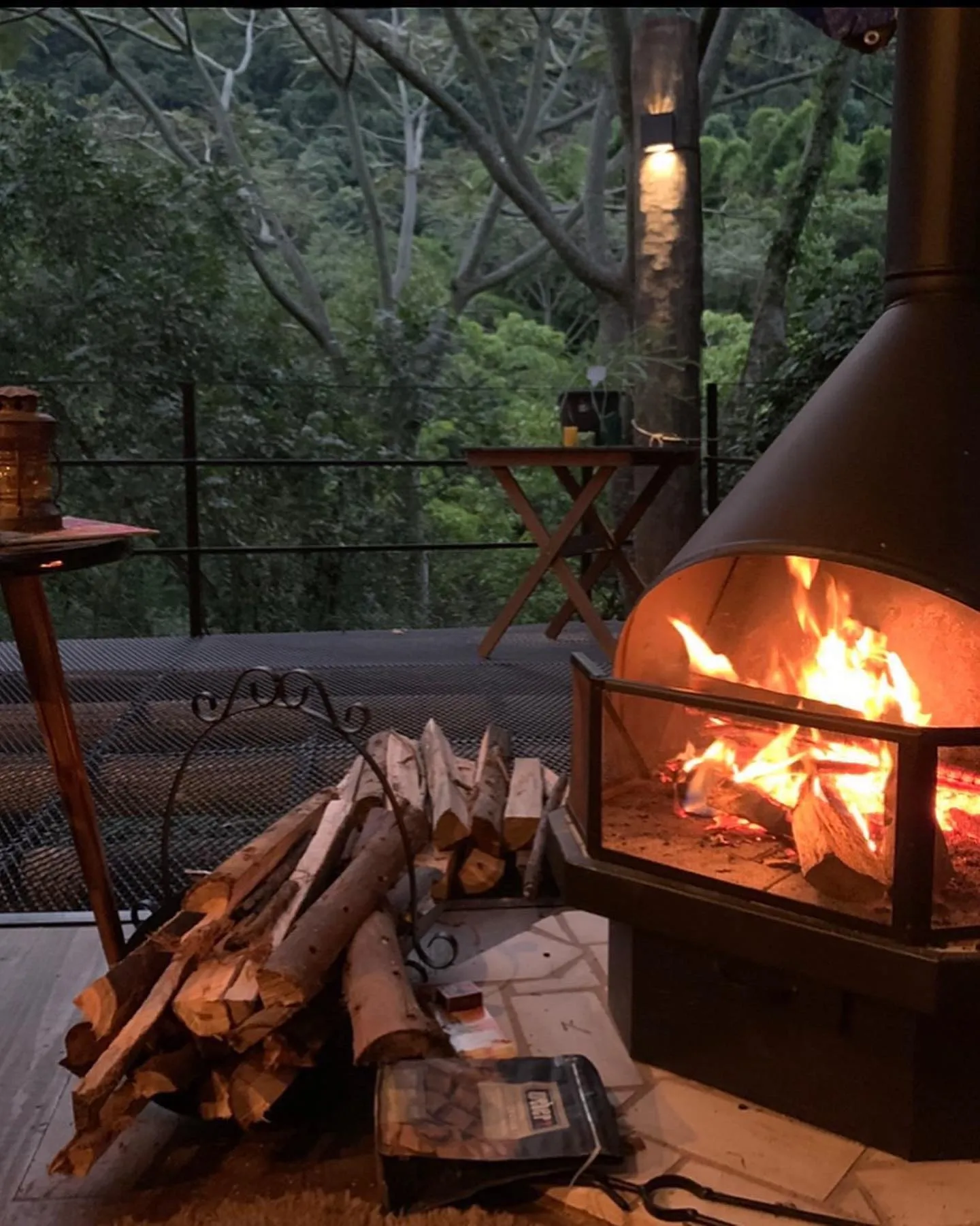 Destaque para a sauna rústica na parte externa, que possui um vidro voltado para a mata e um chuveirão, além das diversas opções de trilhas ao redor.