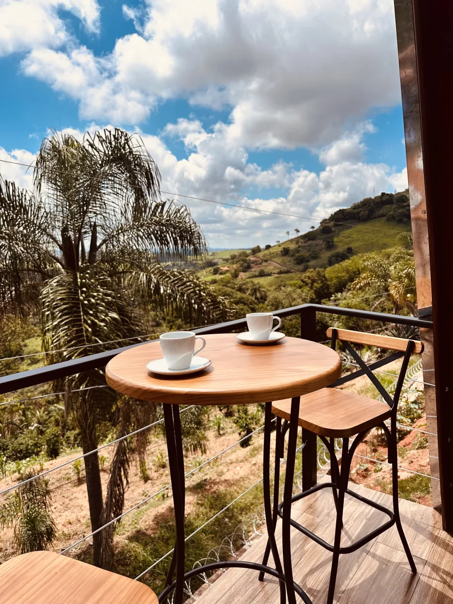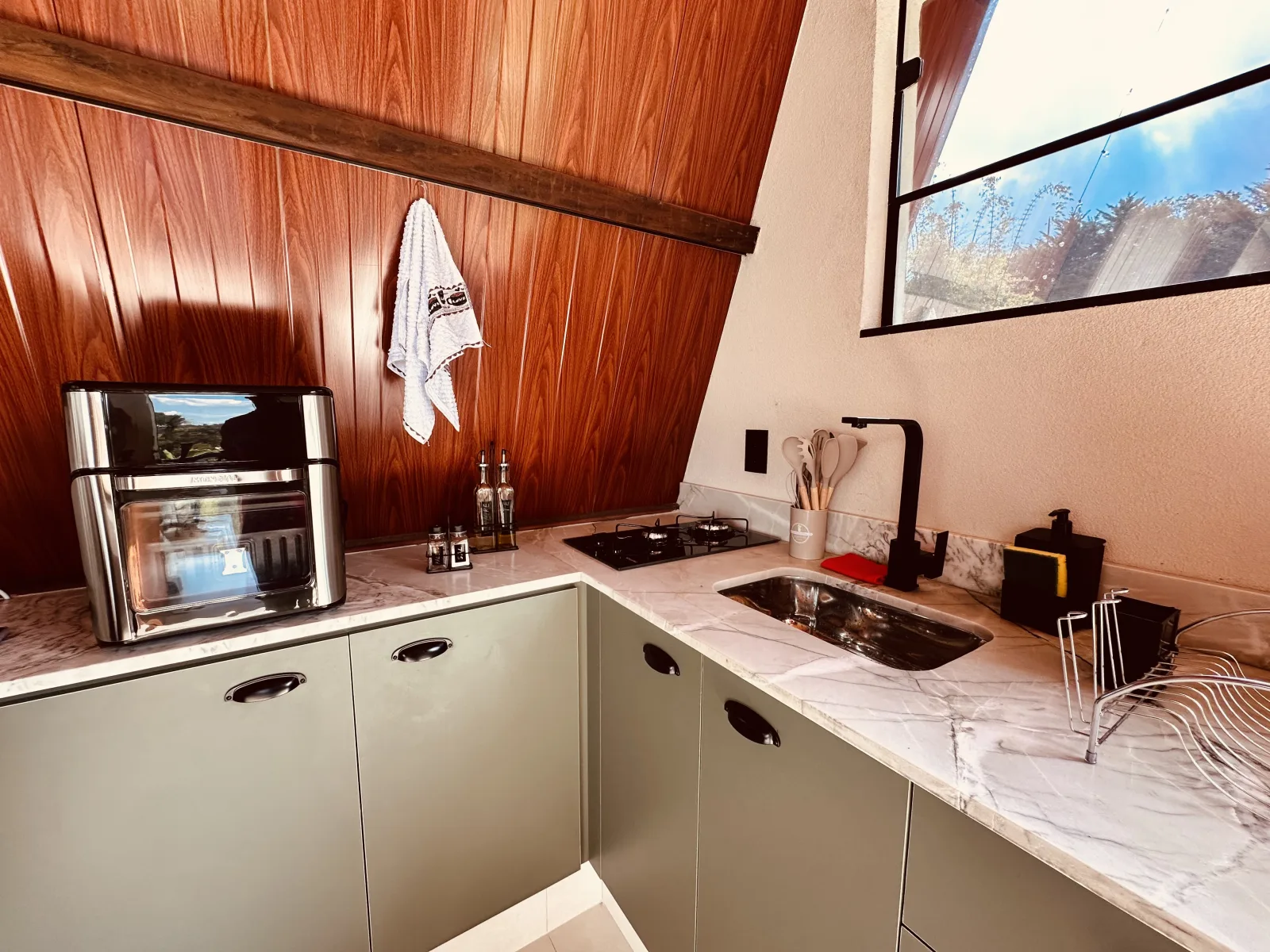 A cozinha compacta, porém completa, oferece tudo o que você precisa: cooktop, frigobar, filtro de agua (fria e gelada), cafeteira de cápsulas, airfryer e aparelho de fondue.