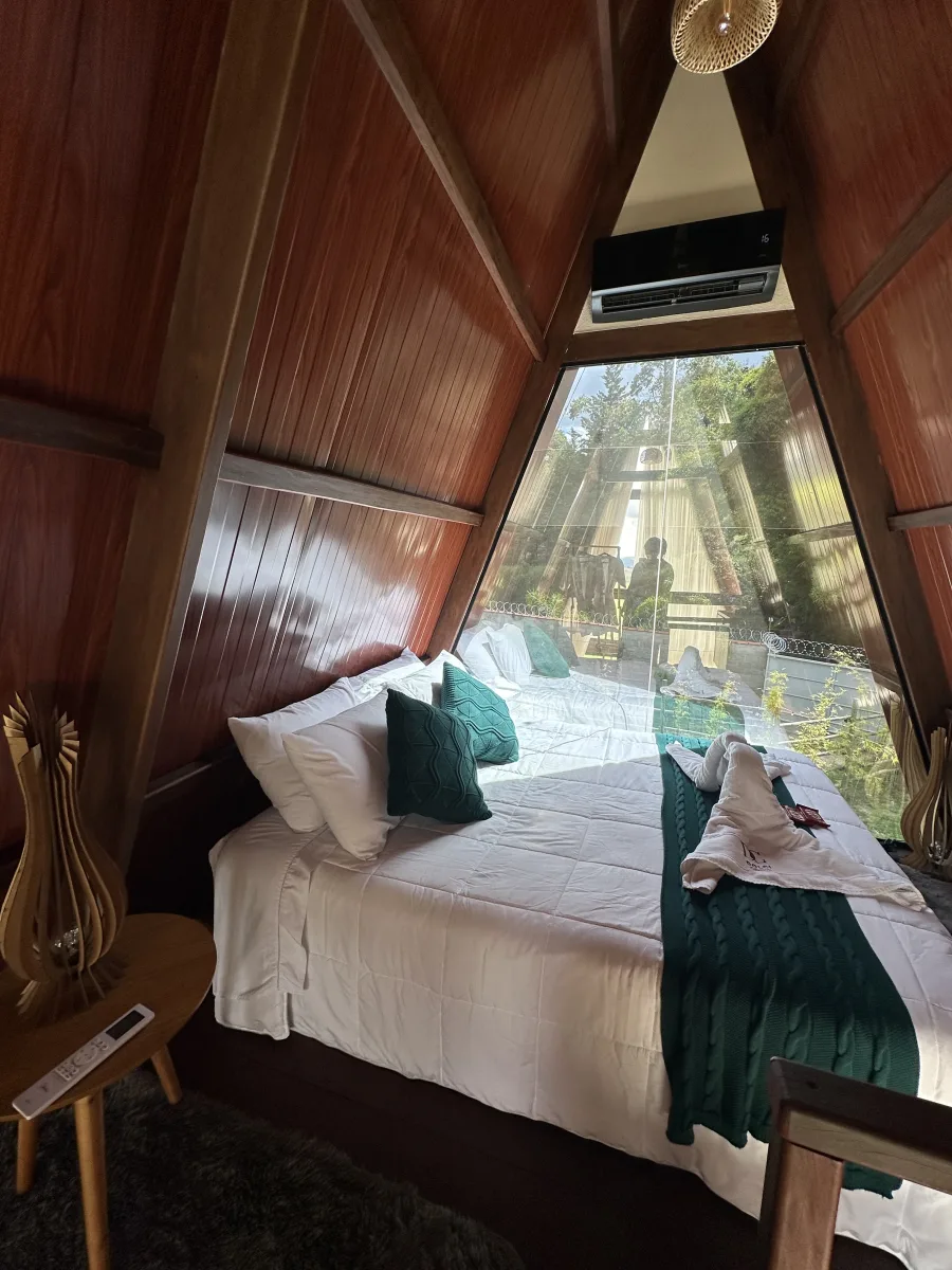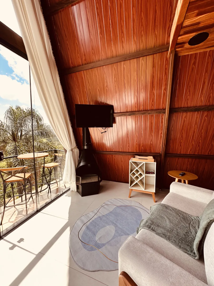 Para seu conforto, toda a cabana conta com aquecimento a gás nas torneiras, chuveiro e banheira, além de ar-condicionado, Wi-Fi, smart TV e uma aconchegante lareira para noites perfeitas.