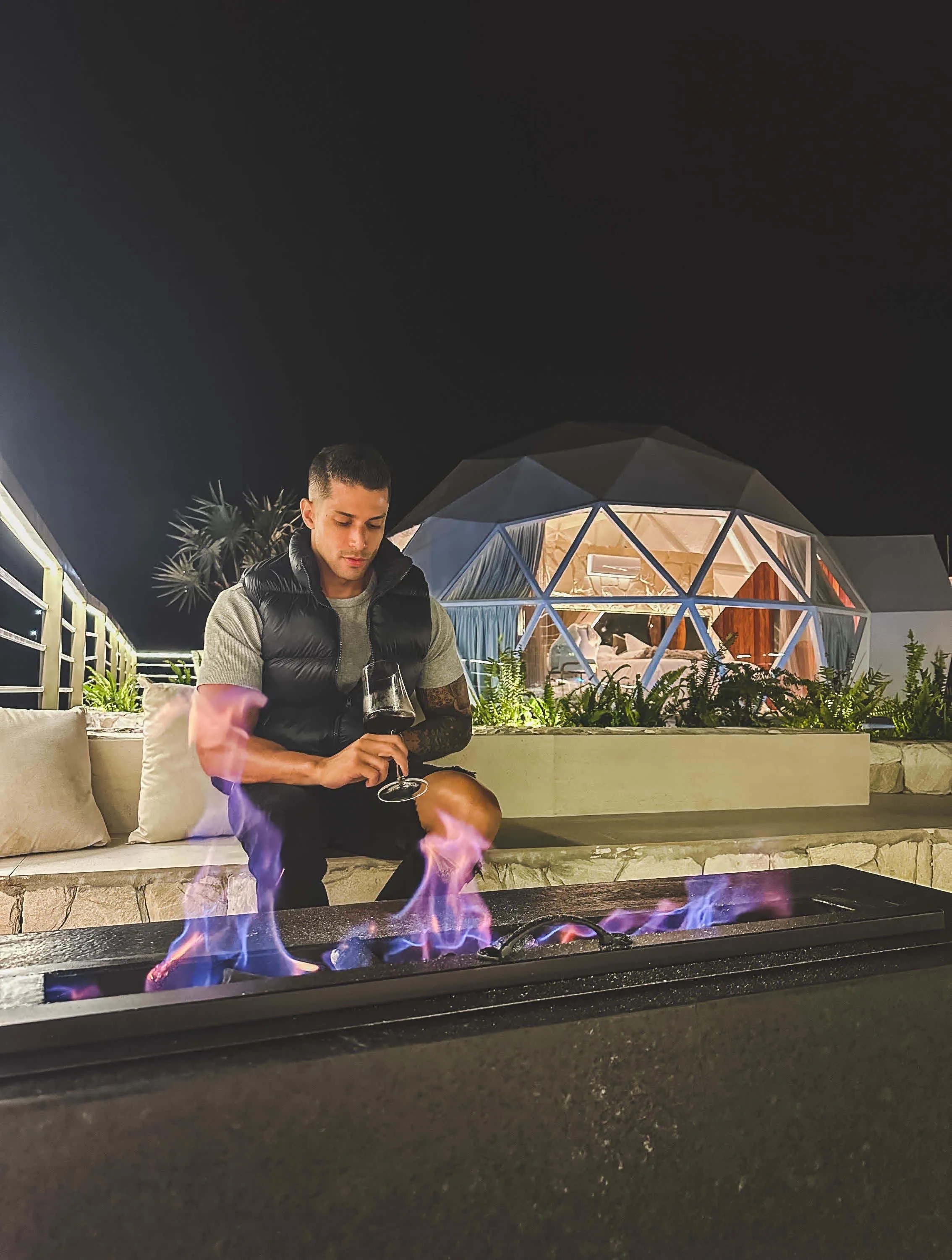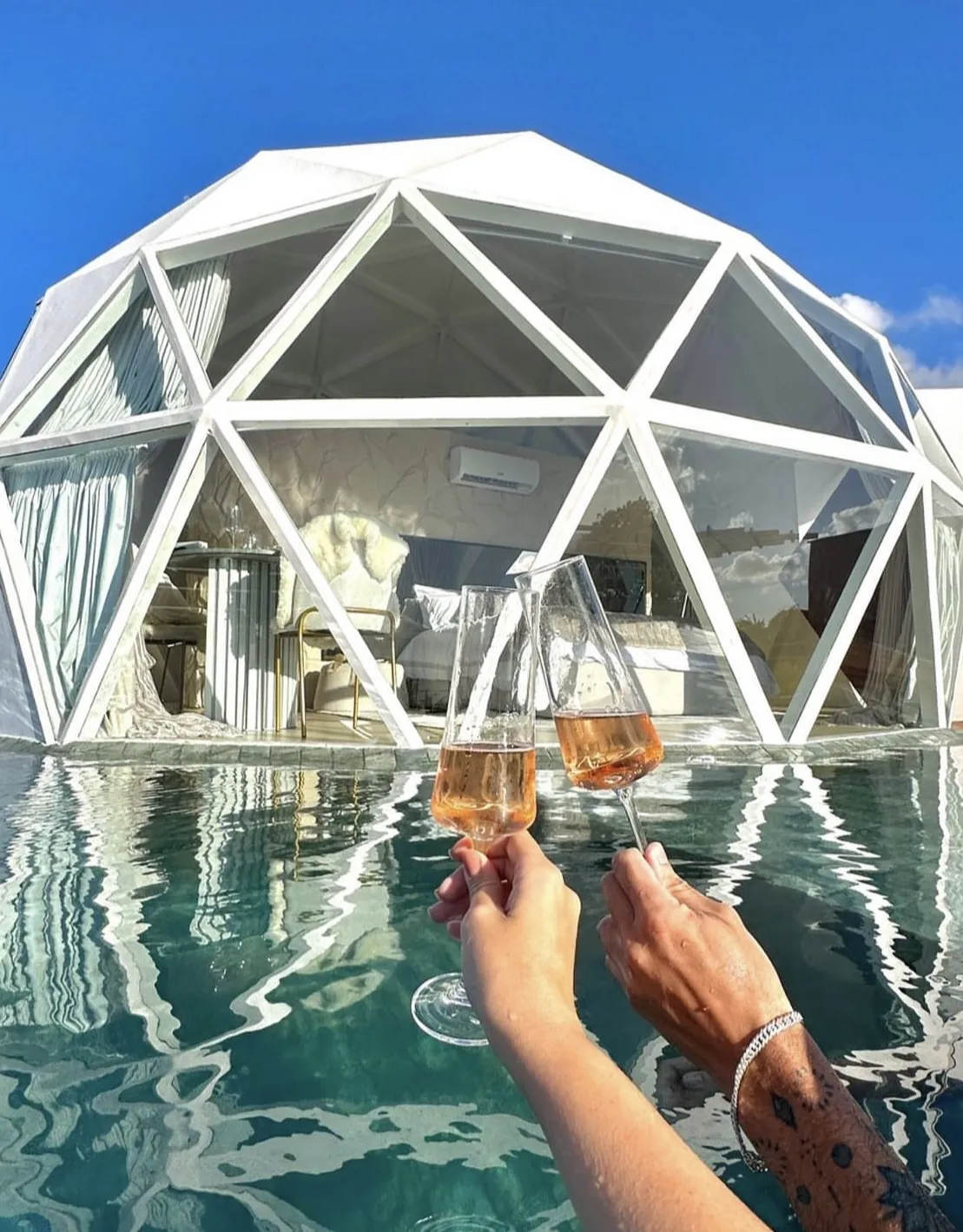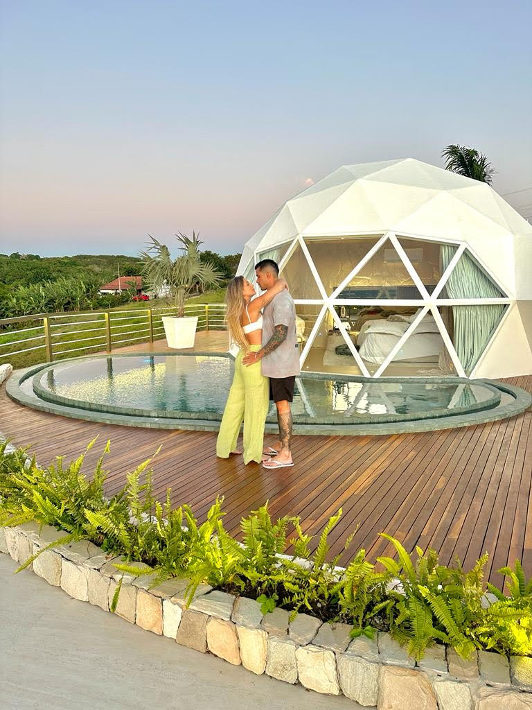 O Domo Bananeiras tem uma linda vista panorâmica do pôr do sol. Dentro, há um banheiro luxuoso, cama, mesa, cozinha completa e, na área externa, uma piscina aquecida, iluminada e com hidromassagem esperando pelos hóspedes. Há também uma lareira para assar marshmallows ou se aquecer tomando um vinho. Além disso, uma rede suspensa para contemplar o céu e uma churrasqueira para preparar um churrasco. Surpreendentemente, uma passagem secreta dá acesso ao cinema privativo, sala de jogos e uma suíte master integrada. Nesse segundo pavimento, podem ser acomodados mais três hóspedes. Uma cesta romântica servida no Domo leva o café da manhã dos sonhos, que está incluso na estadia.