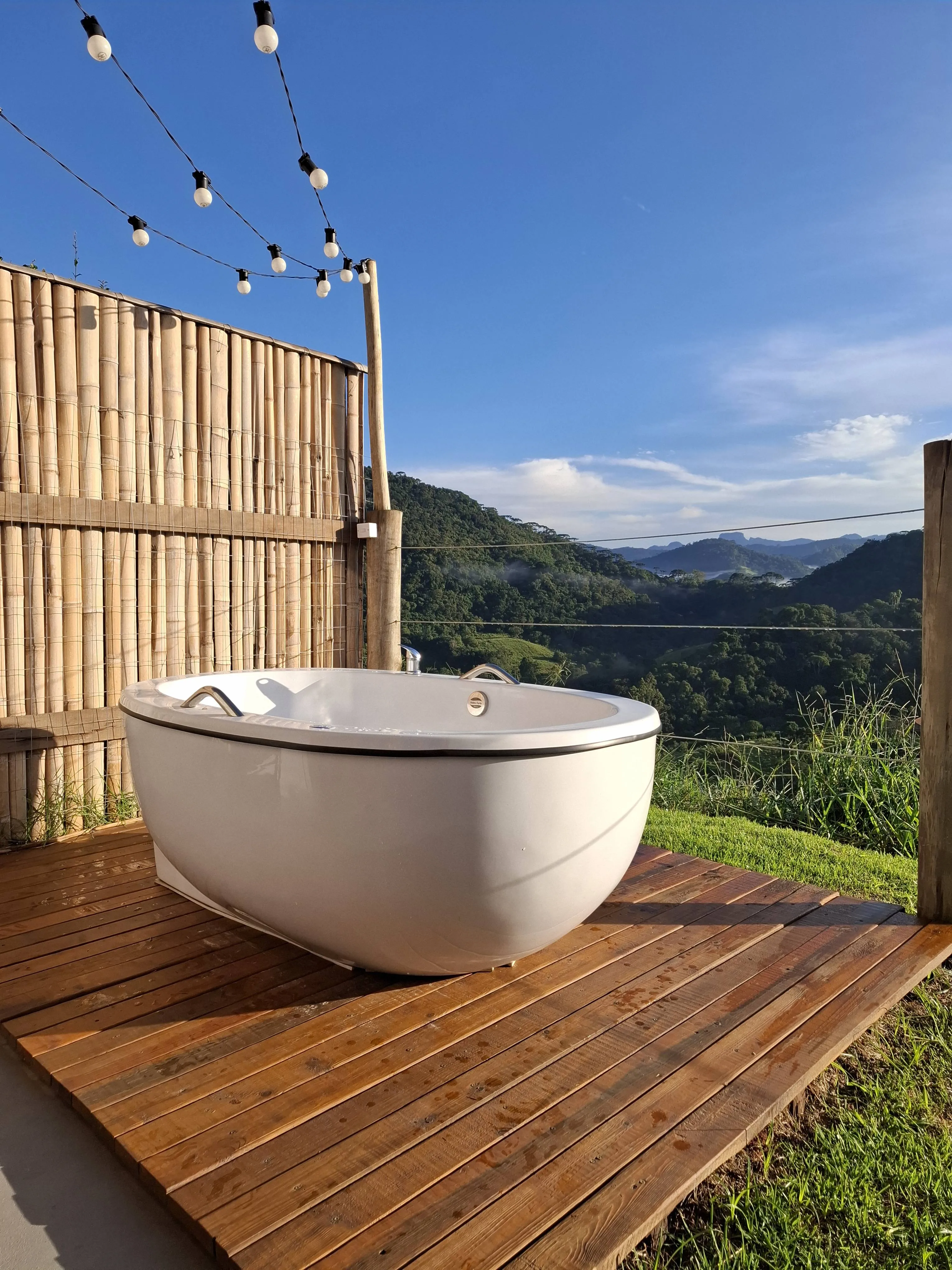 EMBAHÚ SUÍTES é uma propriedade composta por suítes com varanda privativa com banheira de imersão externa e vista para a montanha (Pedra do Baú).