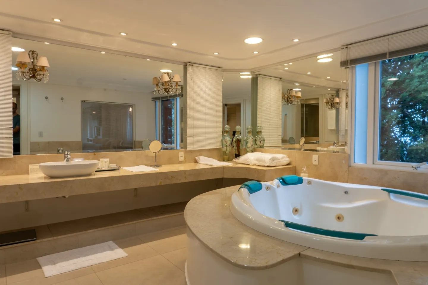Ar condicionado Secador de cabelo TV a cabo / Smart TV Jacuzzi / Ofurô / Banheira Coberta Frigobar Lareira Máquina de Café Enxoval de Luxo (+ Roupão e Pantufa) Sauna Cozinha Estação de trabalho (mesa e cadeira) Piscina Aquecida ou climatizada Borda Infinita Coberta