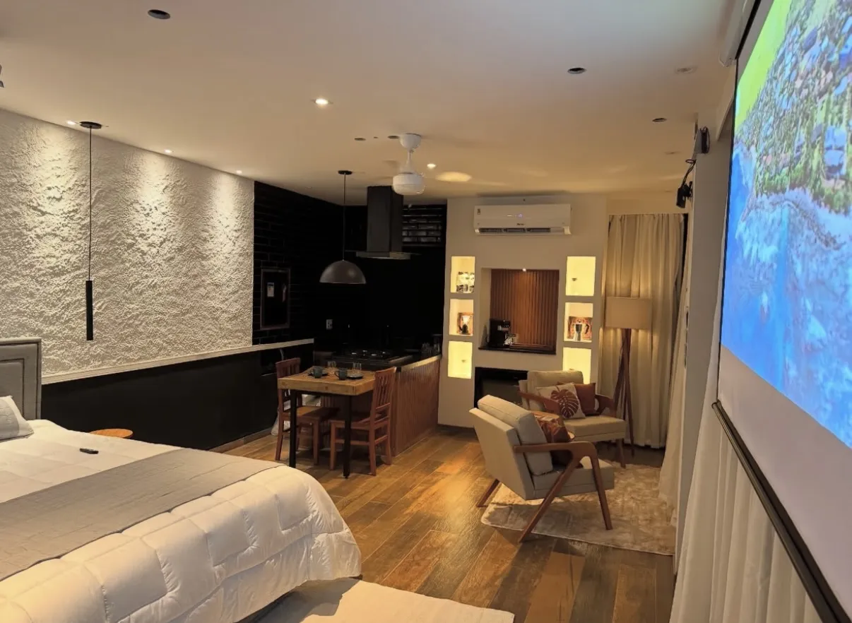 A estrutura inclui ainda projetor de 84 polegadas, som de cinema, chuveiro duplo com vista para a paisagem e seleção de cafés locais para degustação no próprio chalé. Todo o espaço é privativo, garantindo exclusividade e tranquilidade. Pet friendly para animais de pequeno porte, é a escolha ideal para surpreender quem se ama em um refúgio cercado pela natureza, com o charme e o conforto que a ocasião merece.