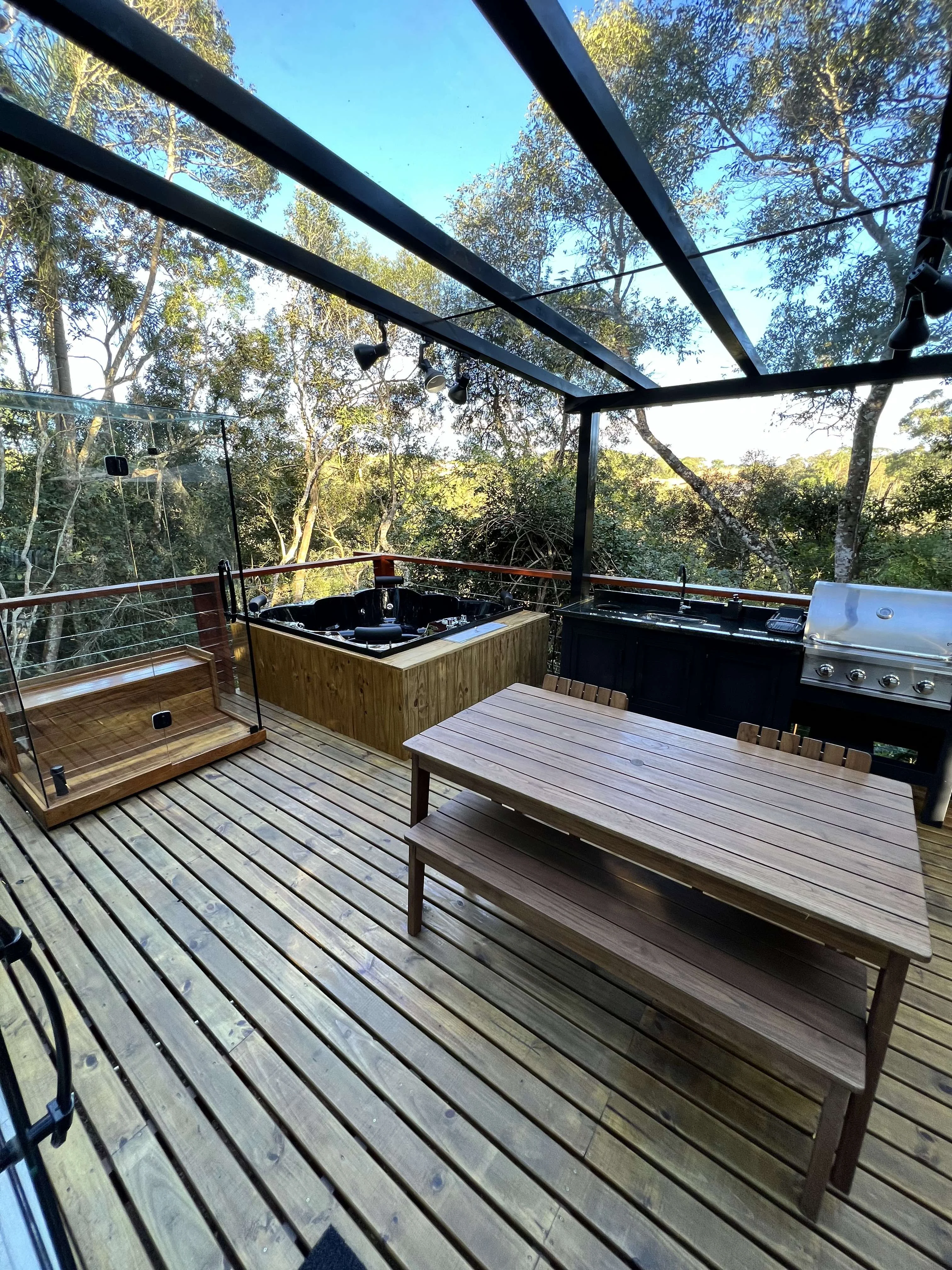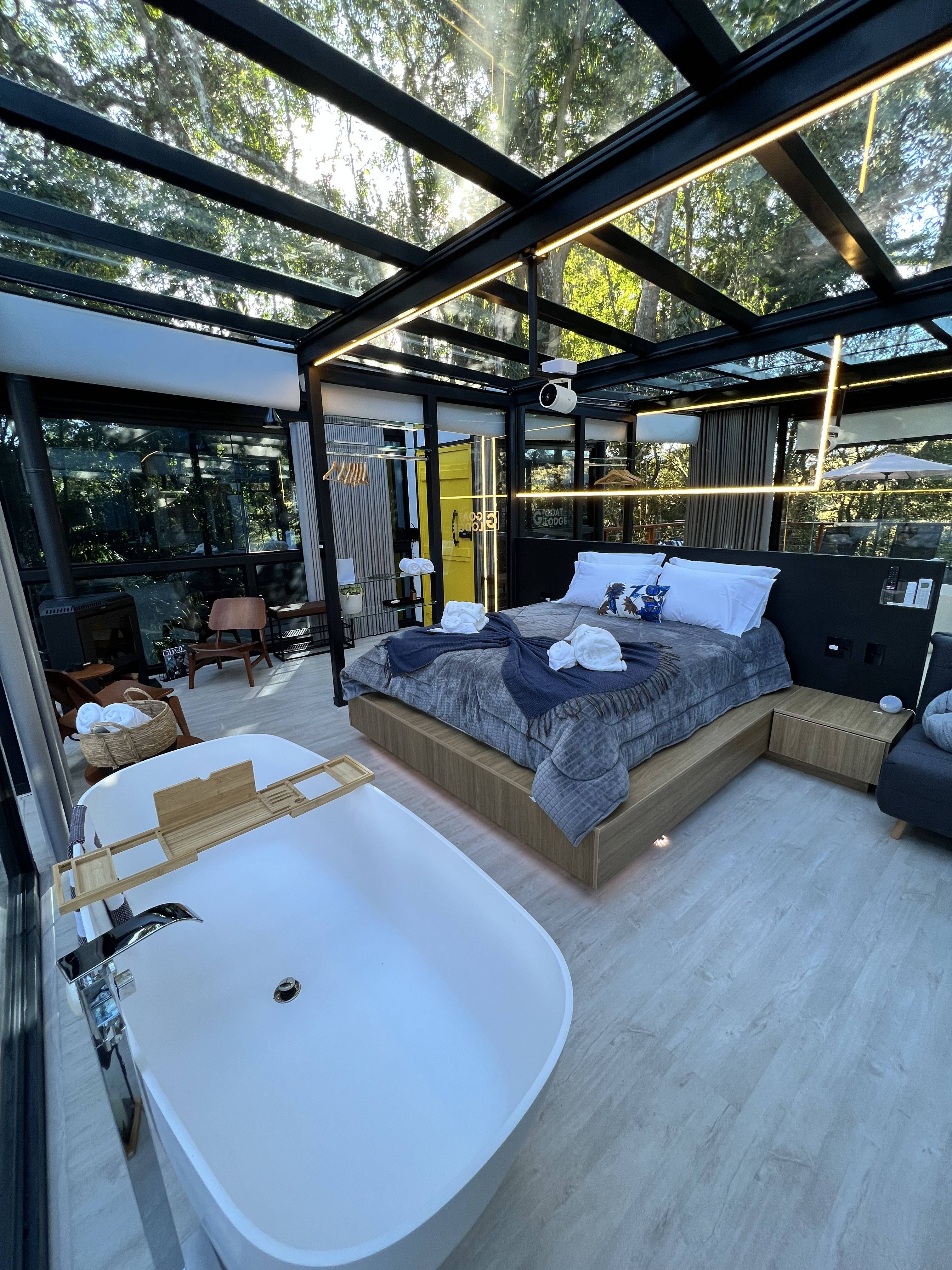 O LOFT São José proporciona uma experiência luxuosa e privativa em meio à natureza, oferecendo conforto e exclusividade em um ambiente único. Com 40 m² e totalmente envidraçado, o loft está localizado em uma área cercada, com entrada segura através de sistema digital. Construído sobre um deck de madeira rodeado pela mata, o local inclui um lago privativo, criando um ambiente perfeito para relaxamento. O espaço conta com uma cama Queen Size com pillow top, smart TV na área externa, projetor de 100”, Amazon Alexa, som Bluetooth, além de roupas de cama e banho de qualidade. A internet de alta velocidade e o ar-condicionado quente e frio garantem o conforto em todas as estações. A lareira interna a lenha, banheira de imersão interna e o chuveiro com água quente proporcionam momentos de aconchego. A cozinha completa, com máquina de café Nespresso e máquina de gelo, oferece praticidade para quem deseja preparar suas refeições. Na área externa, o loft conta com uma banheira de hidromassagem aquecida com cromoterapia, lareira a álcool, churrasqueira a gás, sauna úmida transparente e espreguiçadeiras para aproveitar o ambiente ao máximo. O gazebo com redário, a área externa coberta com pia e mesa, e o estacionamento ao lado do loft, completam a estrutura do local. Além disso, o espaço é pet friendly, tornando-o ainda mais acolhedor para todos.