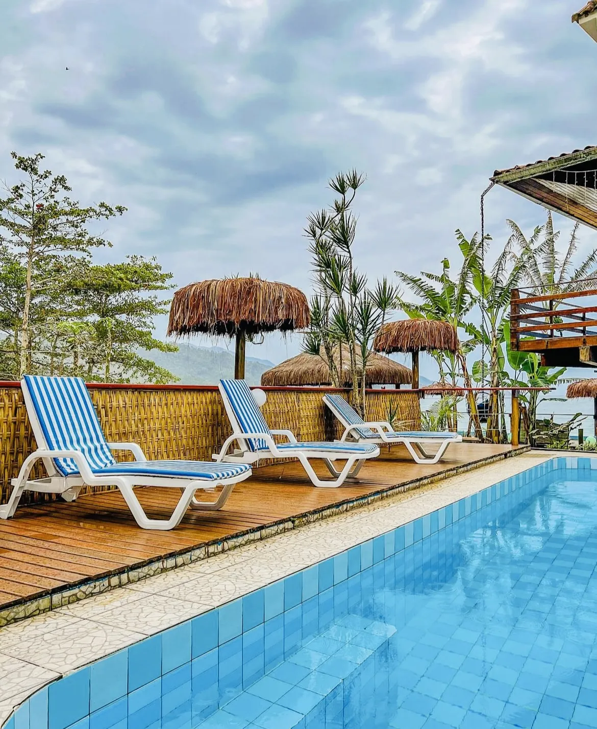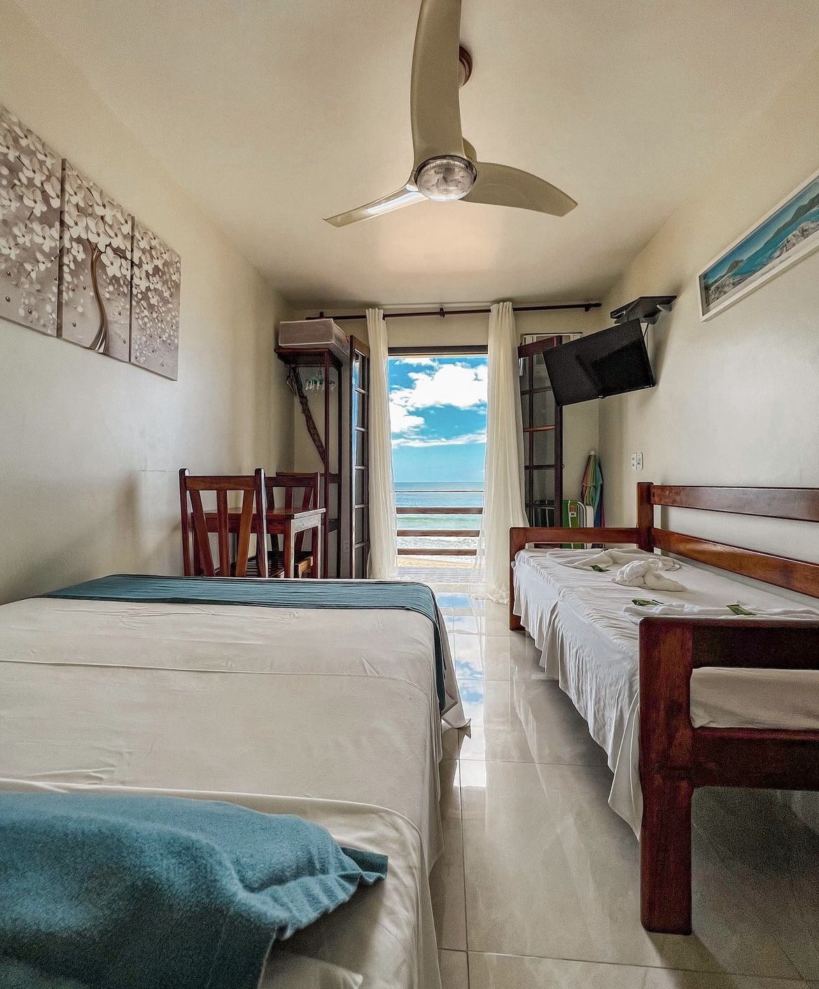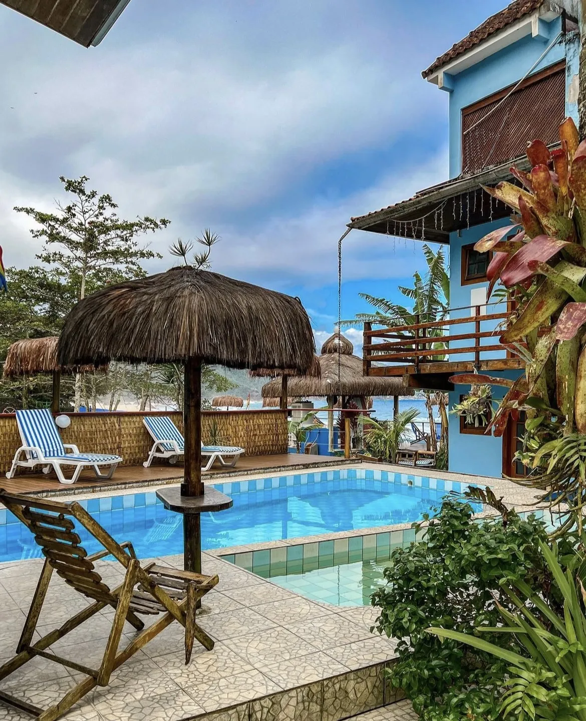 Hotel com os pés na areia de Trindade. O hotel possui duas opções de acomodação. As suítes standard Rio de Janeiro, Angra dos Reis e Paraty saem para uma varanda de frente para o mar. Cada suíte acomoda até 4 pessoas com cama de casal e bicama. Todas possuem ar-condicionado, ventilador de teto, frigobar, TV LCD e ducha com box em vidro. A água possui aquecimento solar e central, contribuindo assim para a proteção do meio ambiente. Já as suítes duplex Ubatuba, São Sebastião, Bertioga e Santos são maiores, possuem 2 ambientes com escada dentro da suíte, subindo para um mezanino que dá acesso a um terraço de frente para o mar. Cada suíte acomoda até 4 pessoas e são equipadas da mesma forma que as standard, porém com ventiladores e TVs em ambos os ambientes, além de uma rede no terraço.