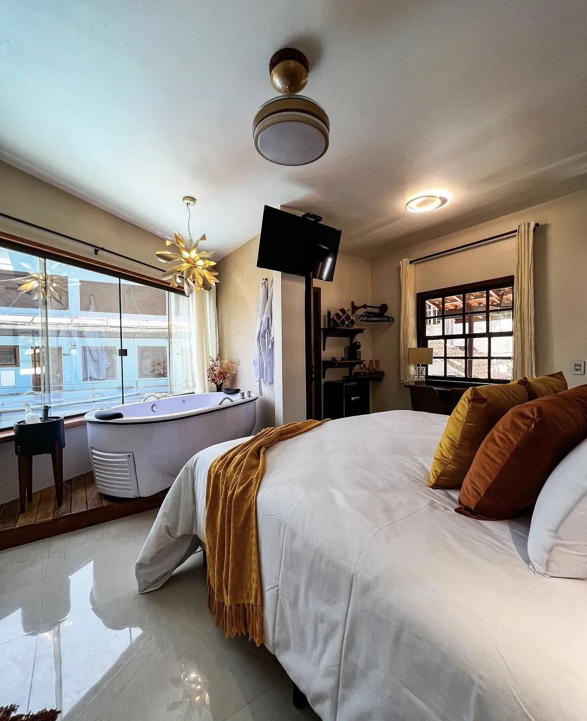 Ar condicionado Secador de cabelo TV a cabo / Smart TV Jacuzzi / Ofurô / Banheira Coberta Frigobar Lareira Máquina de Café Enxoval de Luxo (+ Roupão e Pantufa) Sauna Cozinha Estação de trabalho (mesa e cadeira) Piscina Aquecida ou climatizada Borda Infinita Coberta