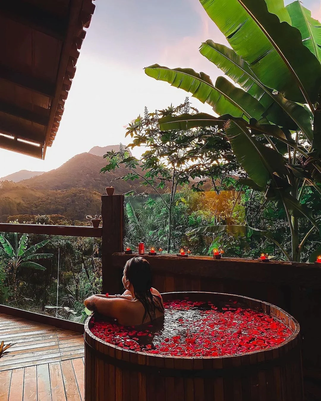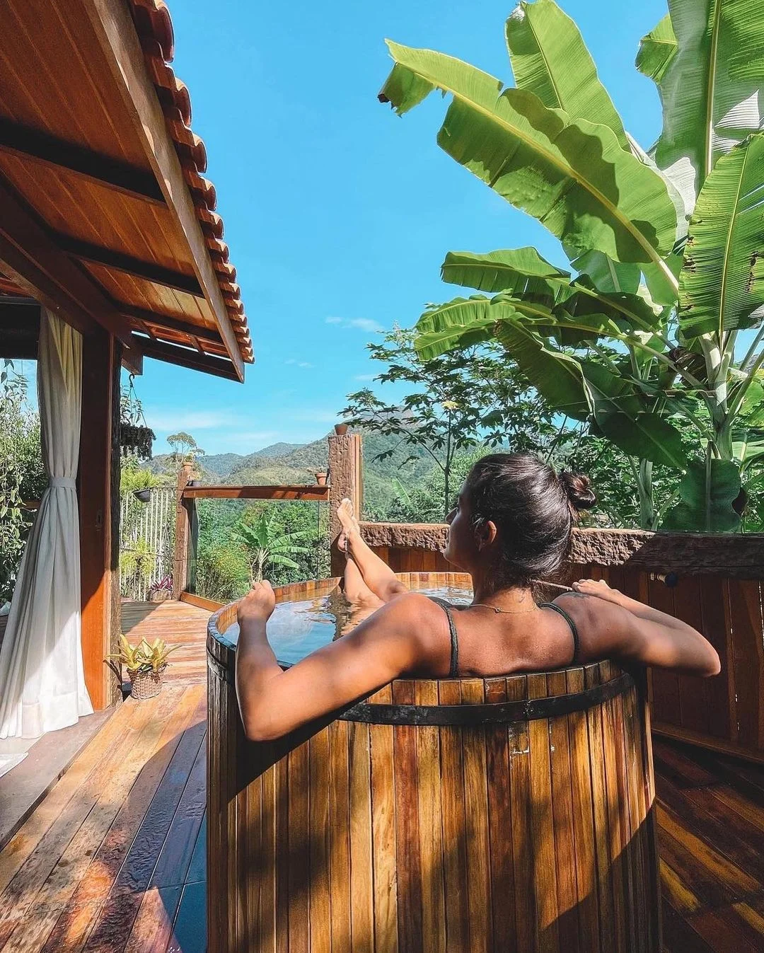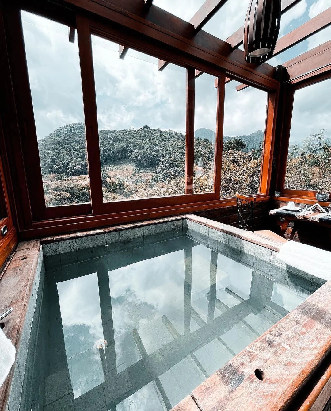Ofurô oriental com água aquecida, Deck privativo, chaise, roupa de cama e banho de primeira linha, chuveiro pressurizado, travesseiro de pluma de ganso, vista para a montanha, smart TV, Wi-Fi e frigobar.