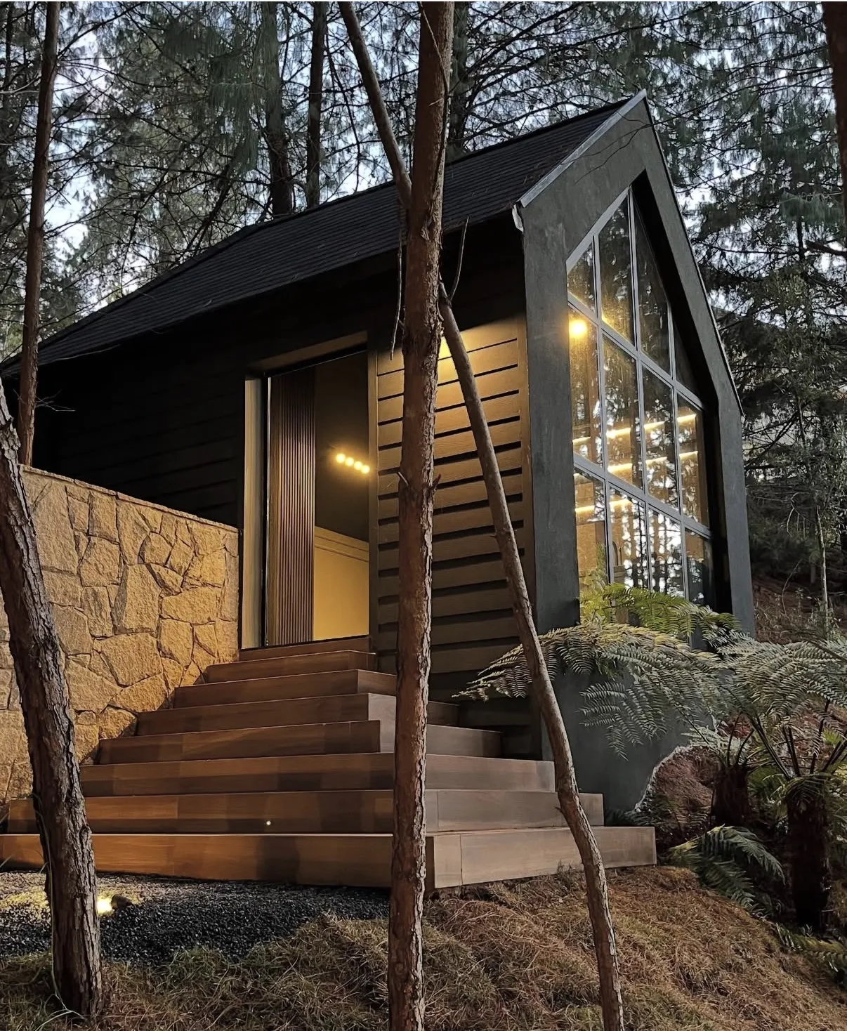 A Cabana Hill integra o complexo In the Woods e destaca-se pela vista elevada e pela sensação de privacidade proporcionada pelo entorno natural. A arquitetura valoriza a integração com o bosque, com pé-direito alto, ampla janela frontal e ambientes que permitem contemplar a copa das árvores, criando uma experiência imersiva e acolhedora.
