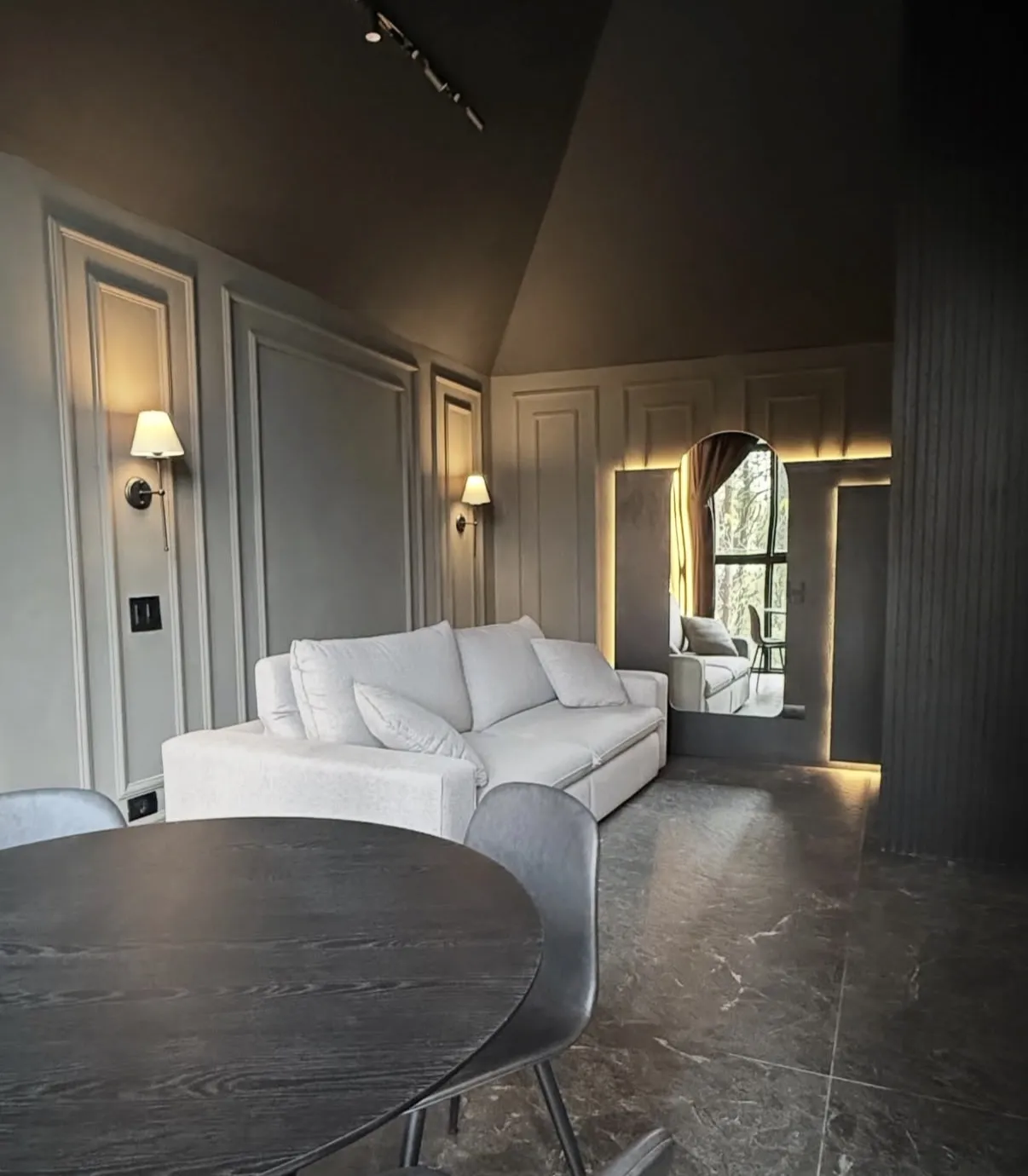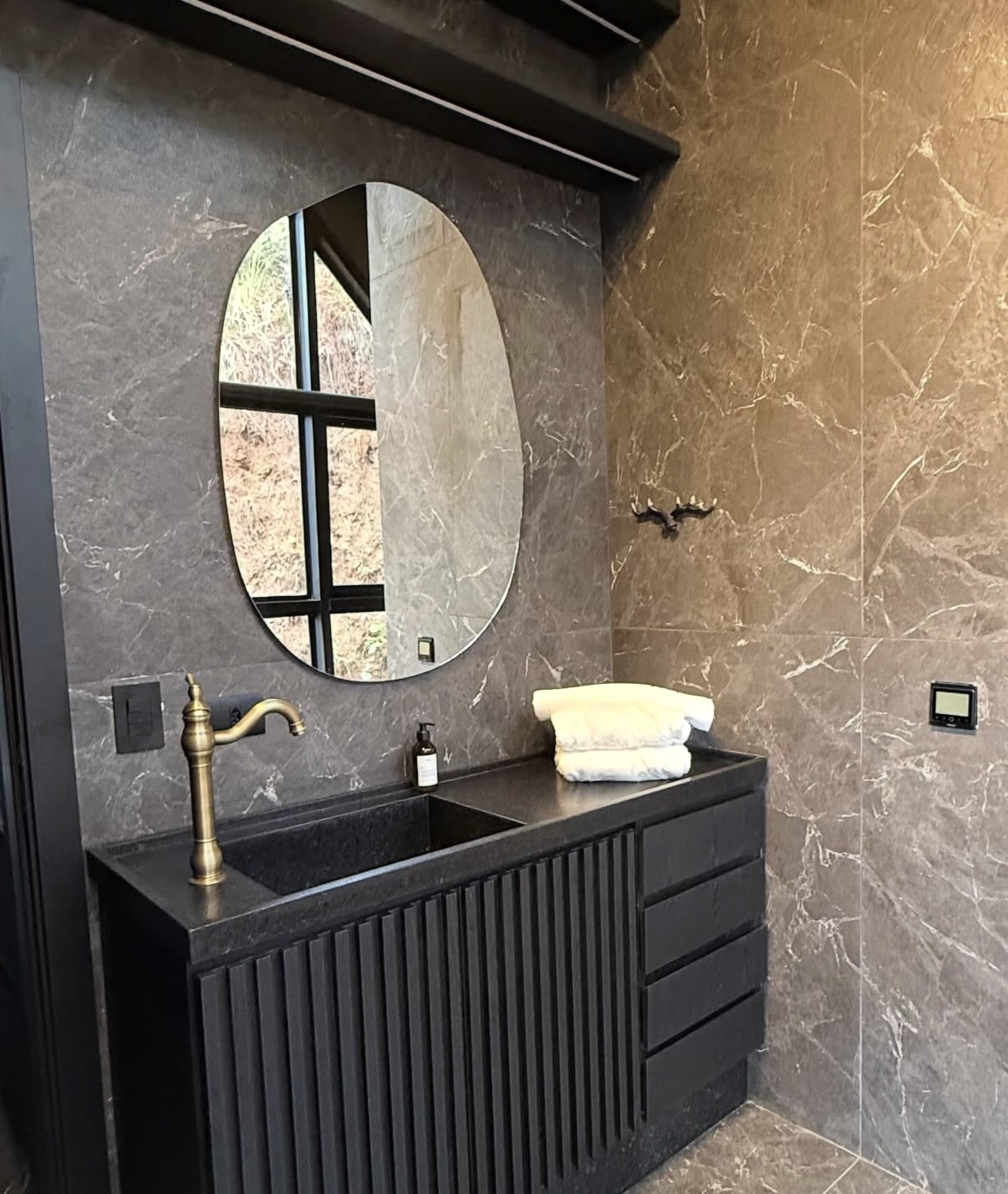 A hospedagem conta com suíte com cama king no pavimento superior e ambientes integrados no nível inferior, incluindo estar, jantar, dormitório adicional, banheiro e espaço de apoio. O deck externo com lareira suíça complementa a experiência, tornando a cabana ideal para casais e famílias que buscam conforto, tranquilidade e conexão com a natureza em Campos do Jordão.