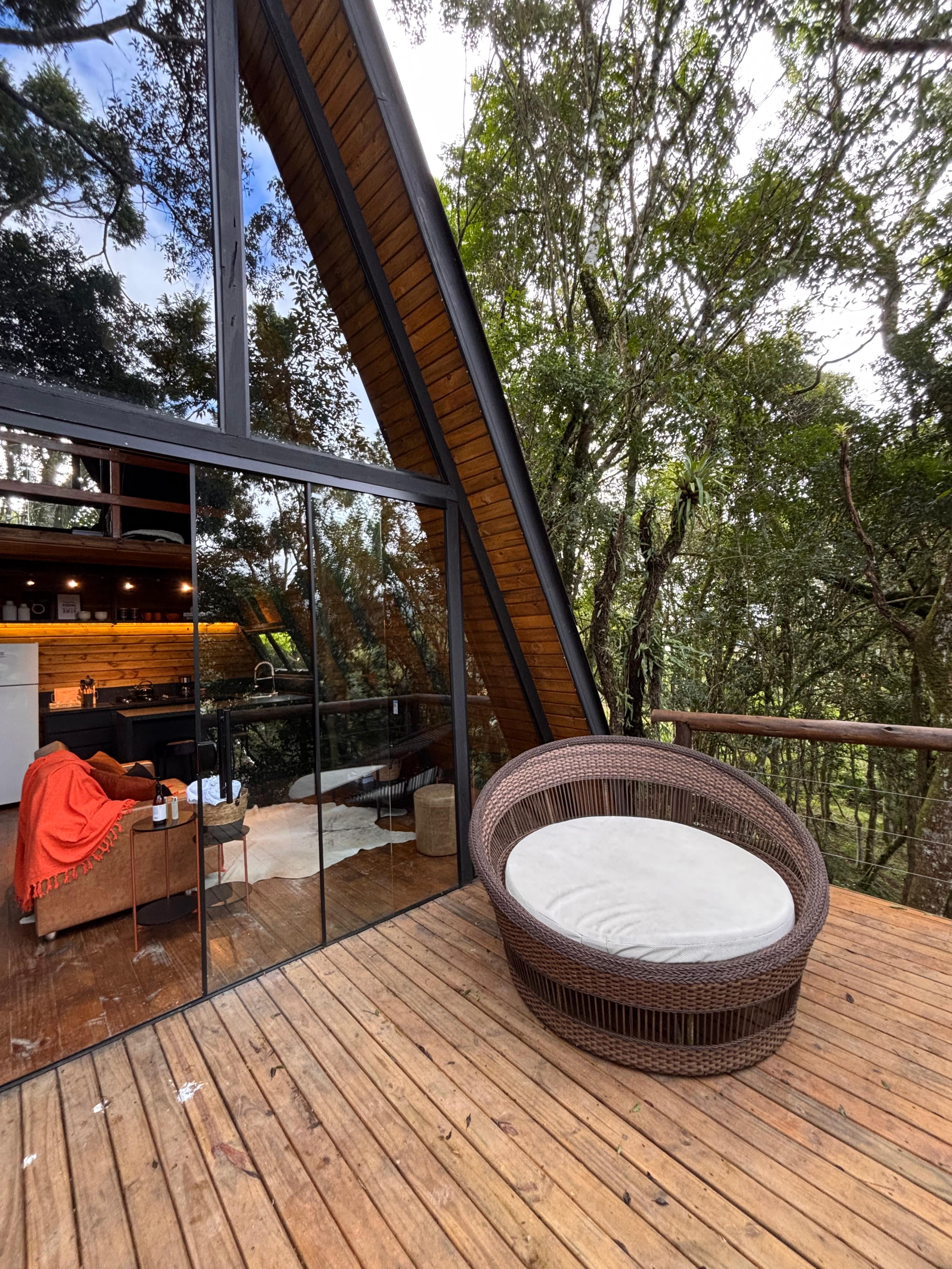 Duas Cabanas, Dignus e Regal, exclusiva para casais, no meio da mata, coberta por árvores, aconchegante, romântica, com lareira e banheira internas para o conforto e relaxamento dos hóspedes.
