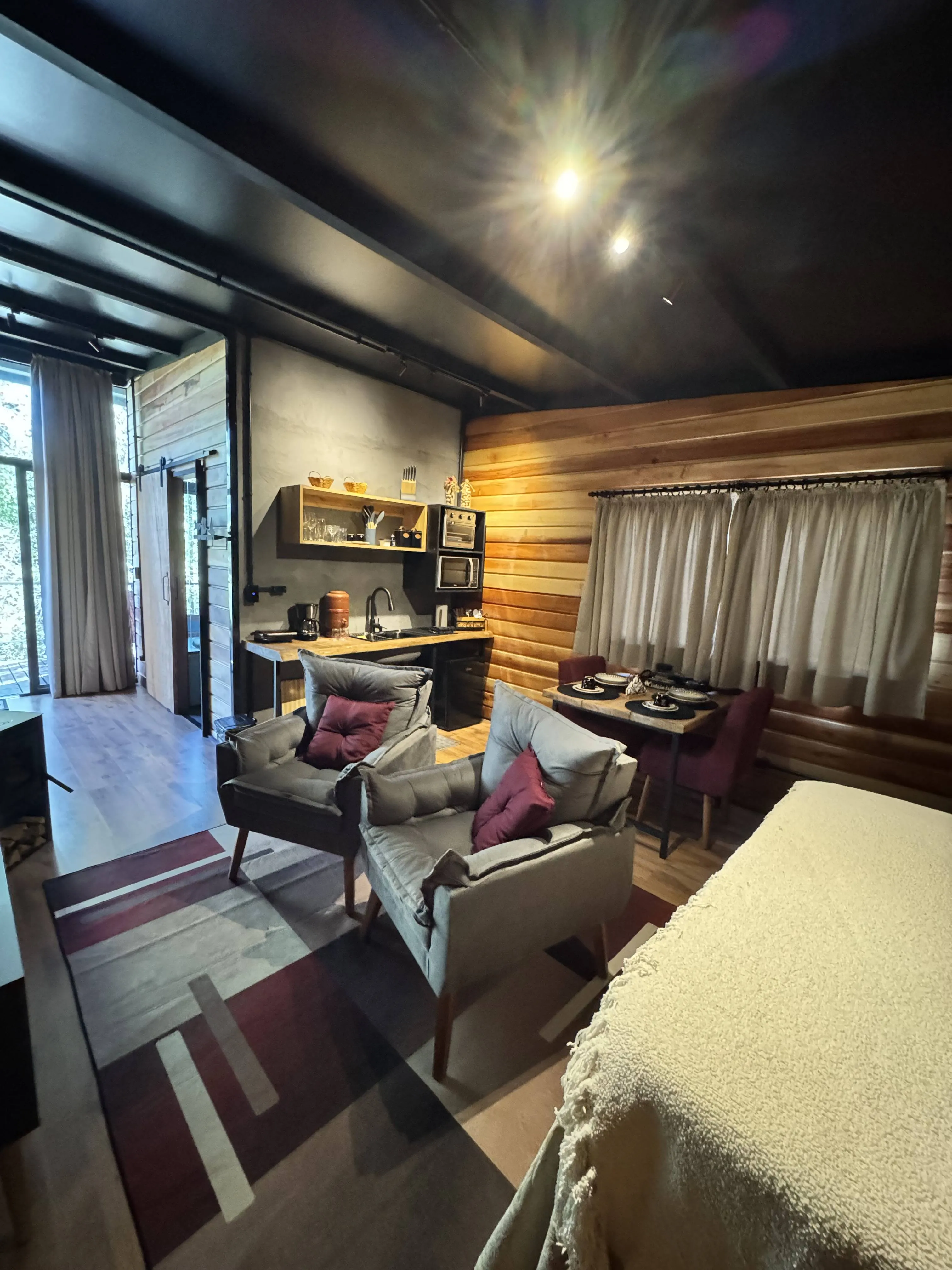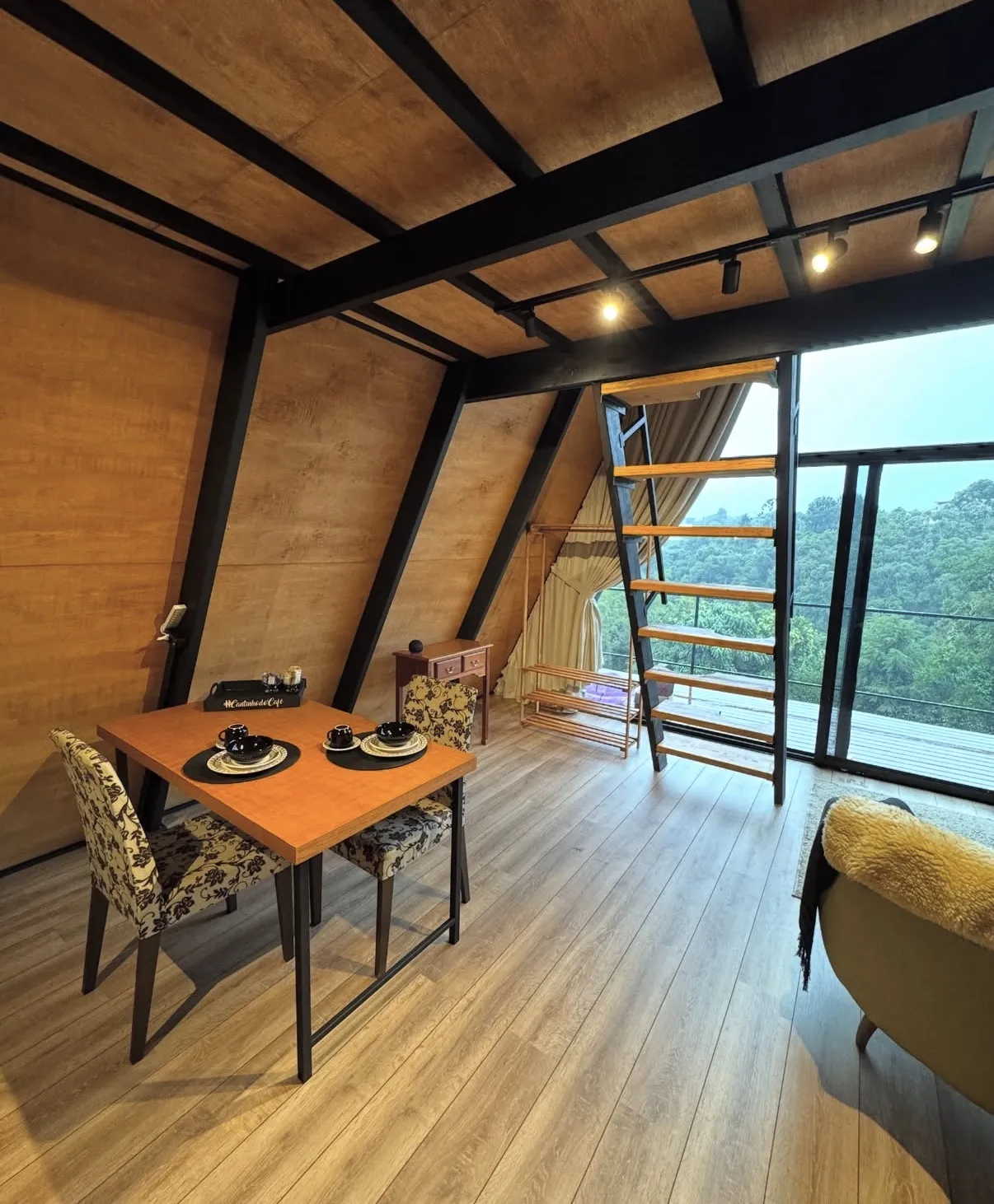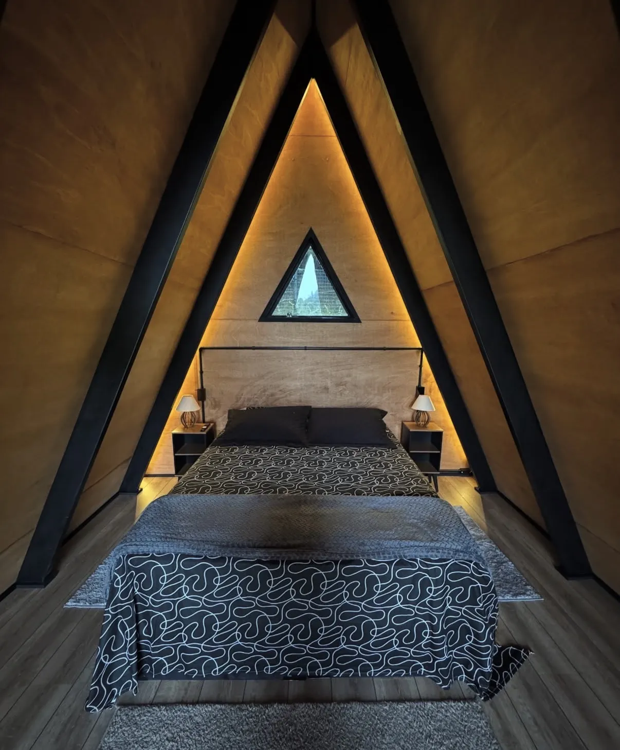 Cabana A-Frame estilo industrial rústico, acomodação para 2 hóspedes em cama queen size, conforto, privacidade a 3km do centro turístico do Capivari.
