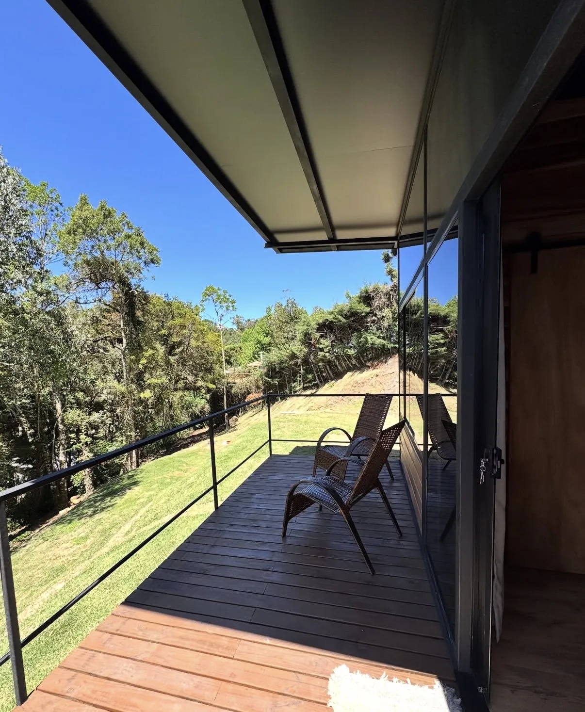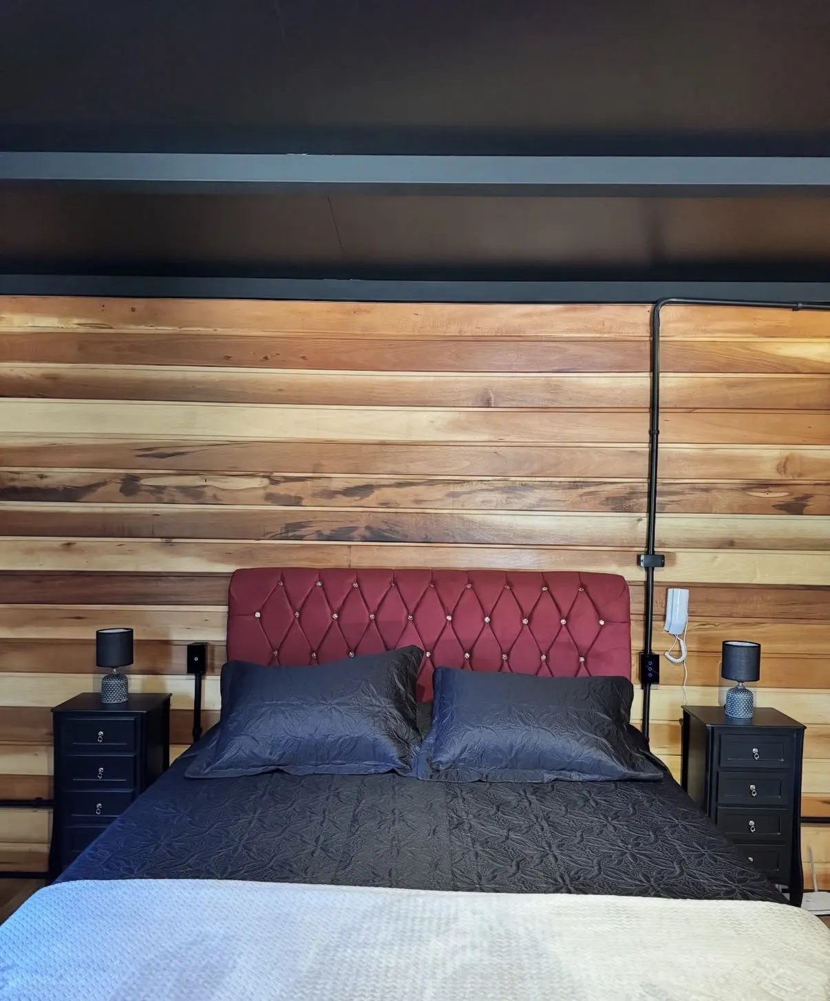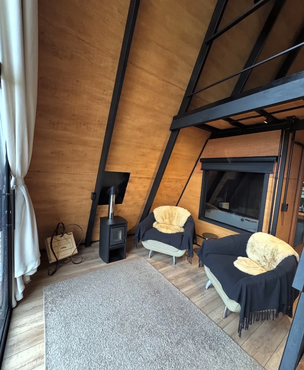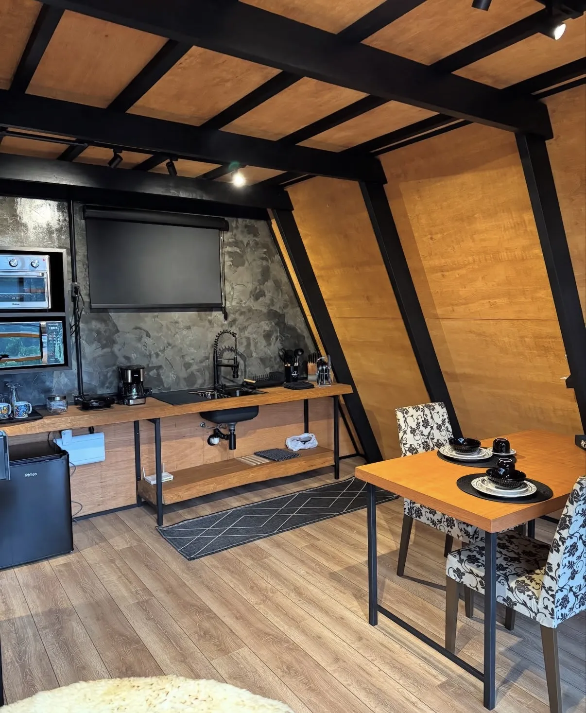 Cabana A-Frame estilo industrial rústico, acomodação para 2 hóspedes em cama queen size, conforto, privacidade a 3km do centro turístico do Capivari.
