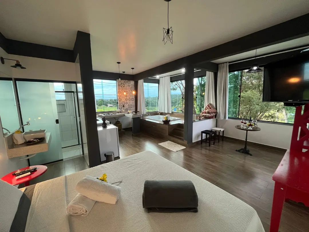 Ar condicionado Secador de cabelo TV a cabo / Smart TV Jacuzzi / Ofurô / Banheira Coberta Frigobar Lareira Máquina de Café Enxoval de Luxo (+ Roupão e Pantufa) Sauna Cozinha Estação de trabalho (mesa e cadeira) Piscina Aquecida ou climatizada Borda Infinita Coberta