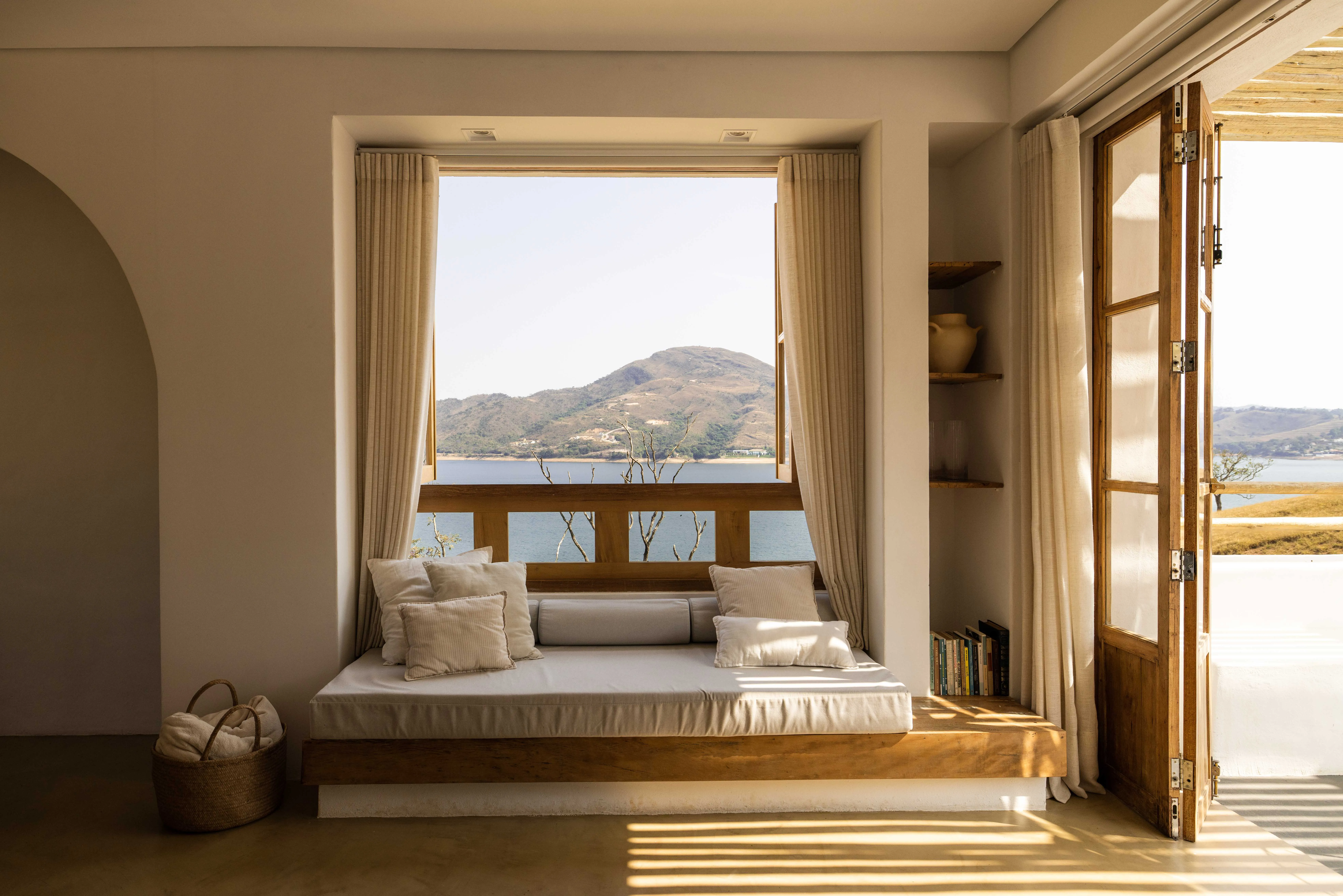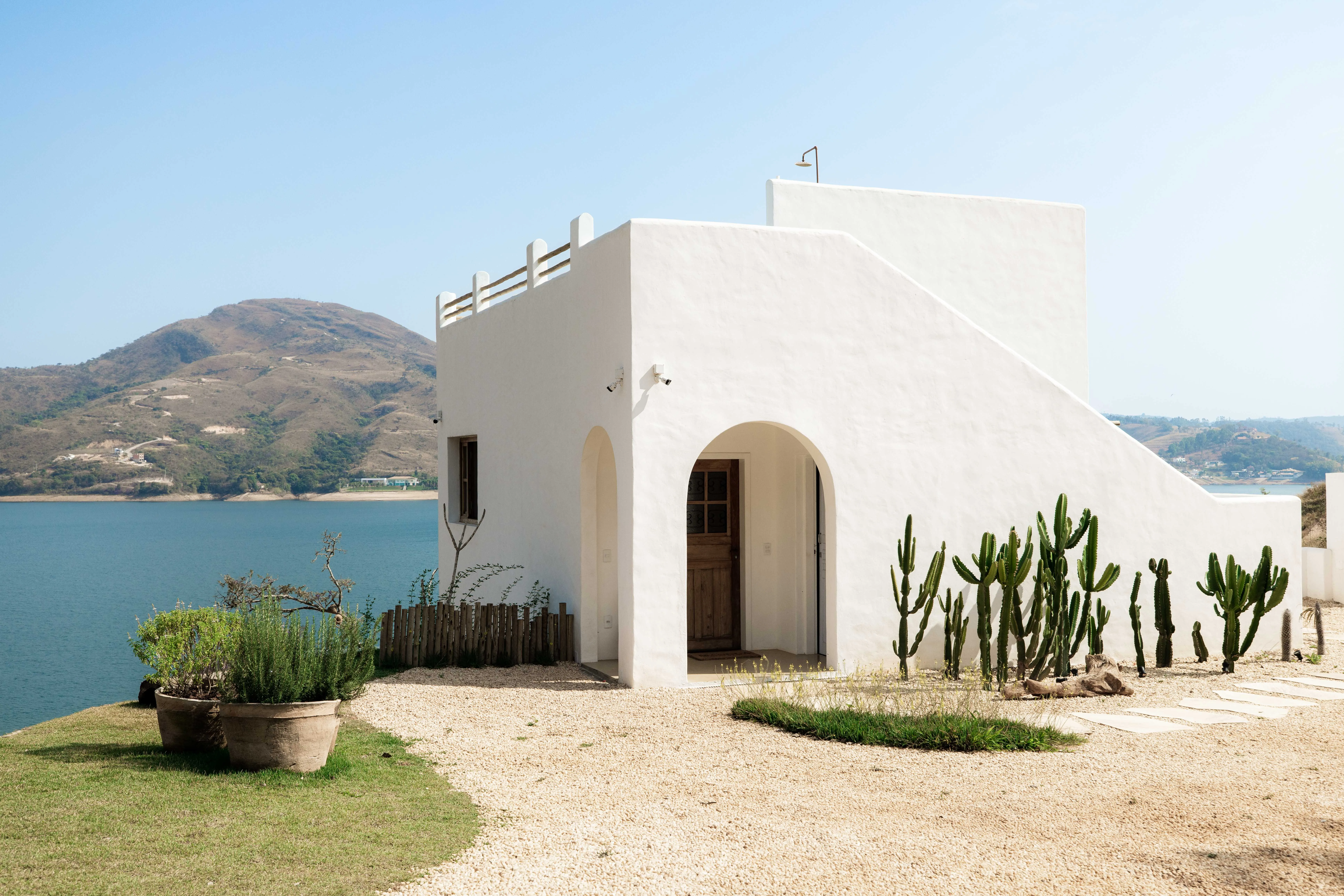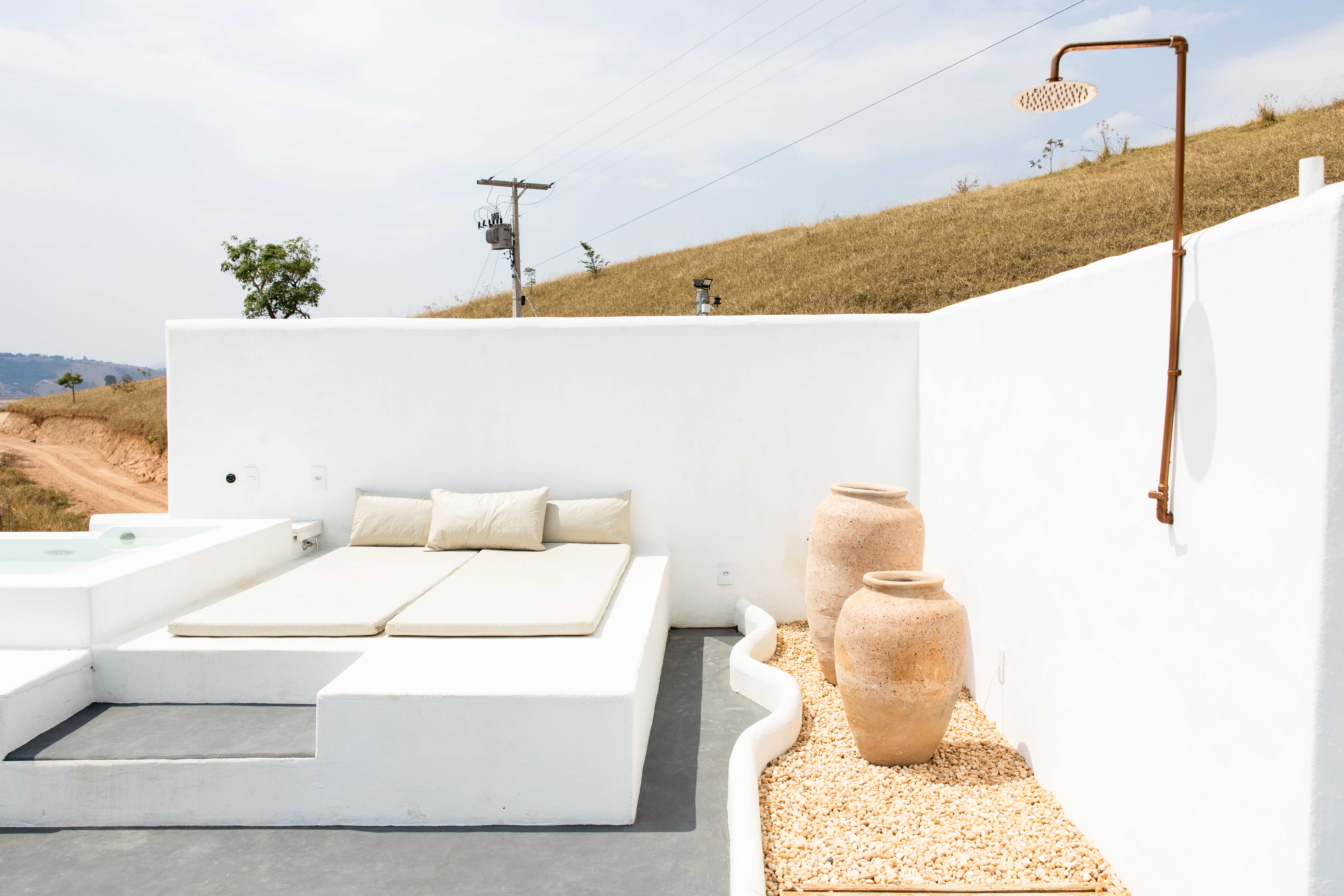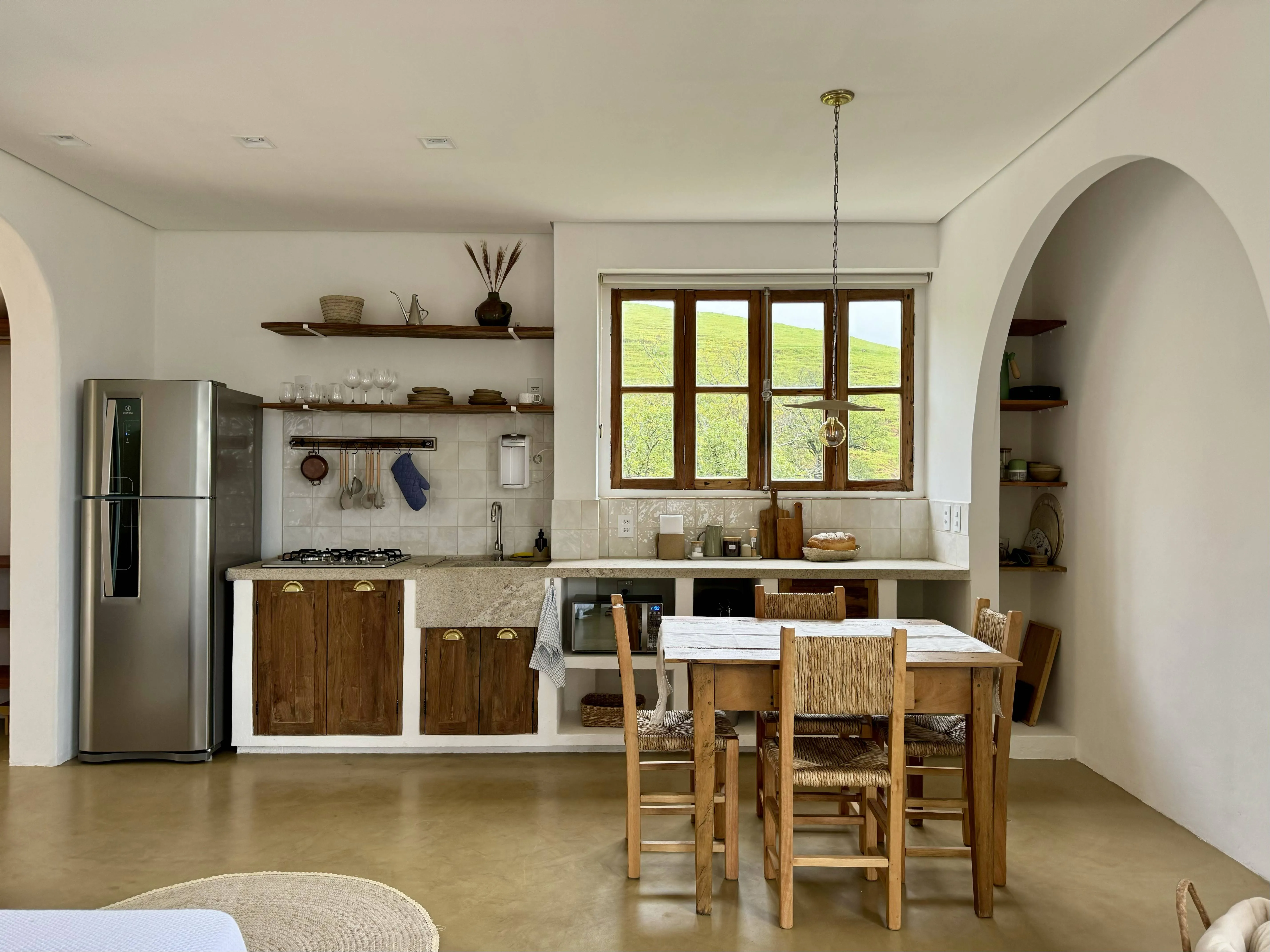 O estilo loft, com quarto e cozinha integrados, garante sempre a melhor vista de qualquer ambiente. A inspiração mediterrânea divide um espaço com as raízes mineiras dos anfitriões, em uma casa cheia de significados: a mesa da primeira casa dos avós, as janelas feitas da árvore do quintal da roça e até os utensílios de cerâmica da cozinha, feitos um a um pela anfitriã.