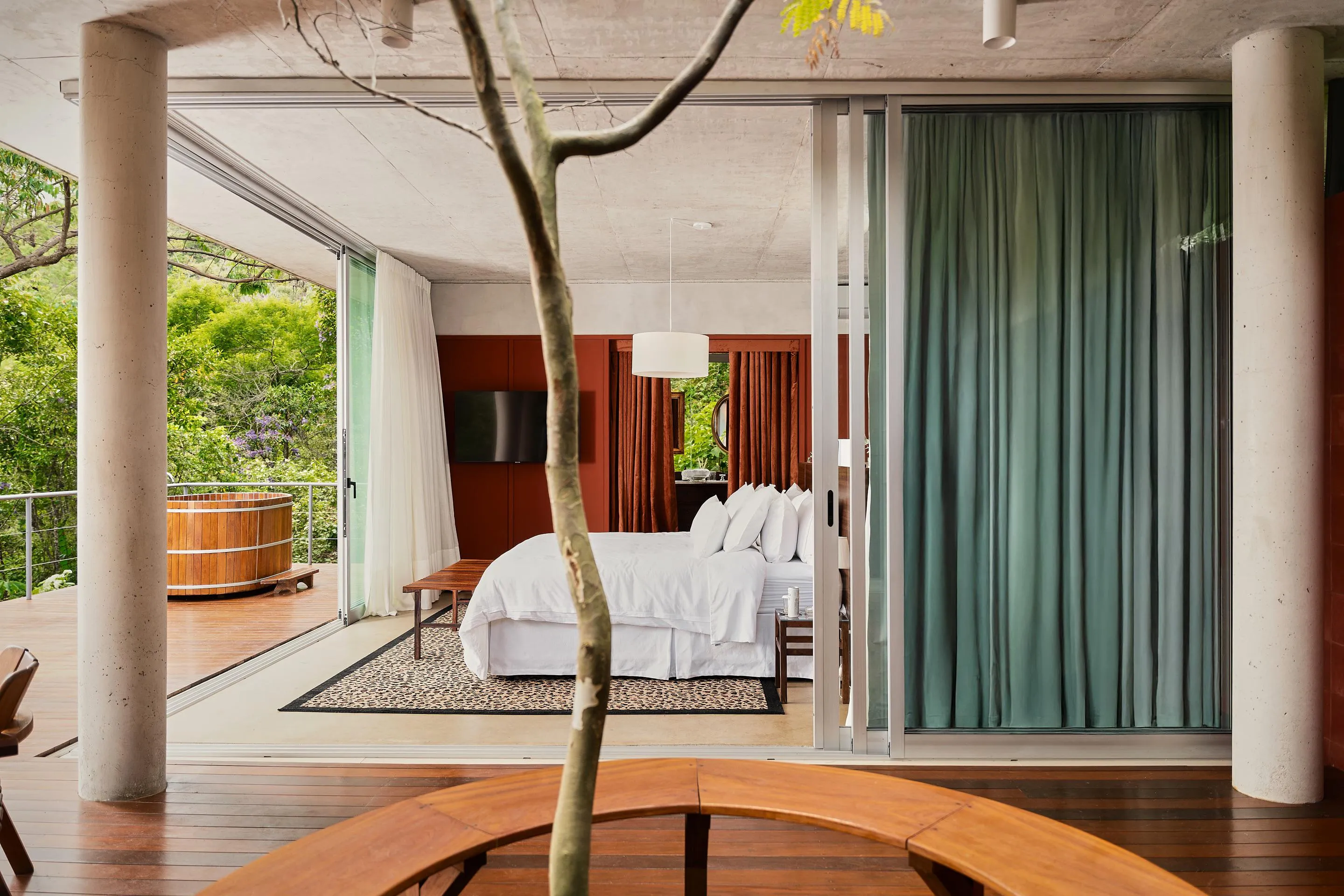 A área social conta com sala ampla, lareira a gás e mesa de jantar, além de cozinha integrada equipada para preparo de refeições. O quarto dispõe de cama king size, enxoval completo, cortinas blackout, ar-condicionado com aquecimento e televisão, enquanto o banheiro oferece chuveiro com água quente, toalhas macias, aquecedor de toalha, secador e amenities. Na parte externa, rede suspensa e ofurô com água quente convidam ao relaxamento, todos conectados ao deck principal com espaço gourmet, horta de temperos frescos, churrasqueira e firepit. Também são disponibilizados acessórios para treino ao ar livre, além de produtos orgânicos e pães artesanais selecionados da região. Entre os serviços adicionais, há opção de Private Chef, market concierge para bebidas e carta de vinhos exclusiva, bem como sessões de massoterapia, contratados separadamente da diária.