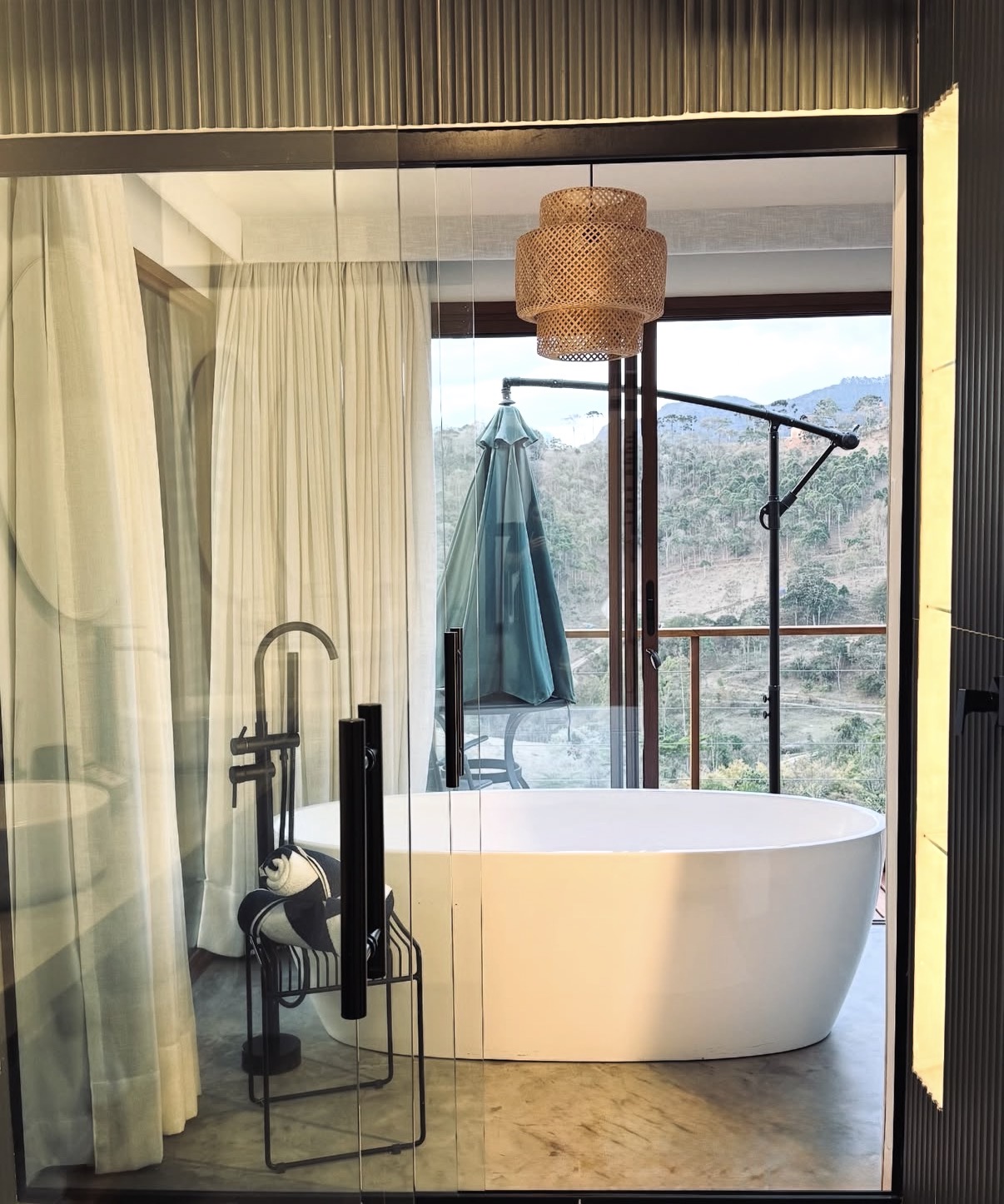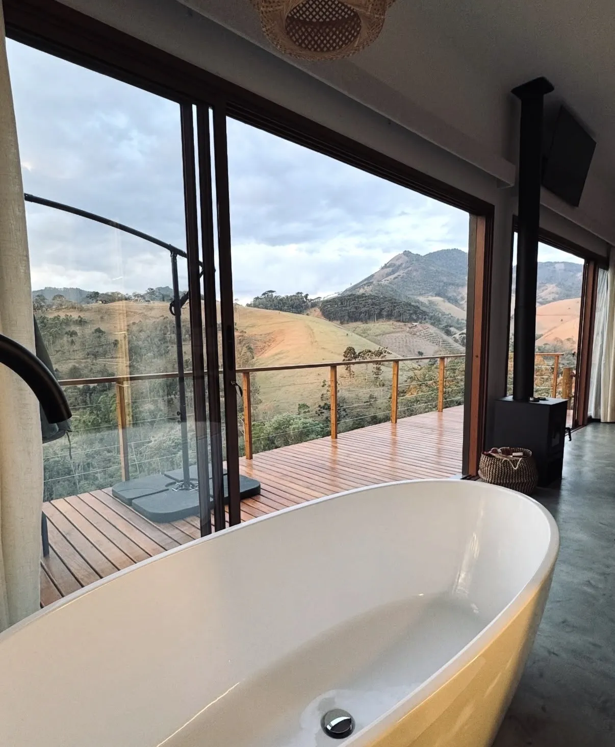 A cabana possui 46m2, construída para oferecer uma experiência única, vista deslumbrante e conforto de alto padrão para você poder apreciar as montanhas como uma moldura.