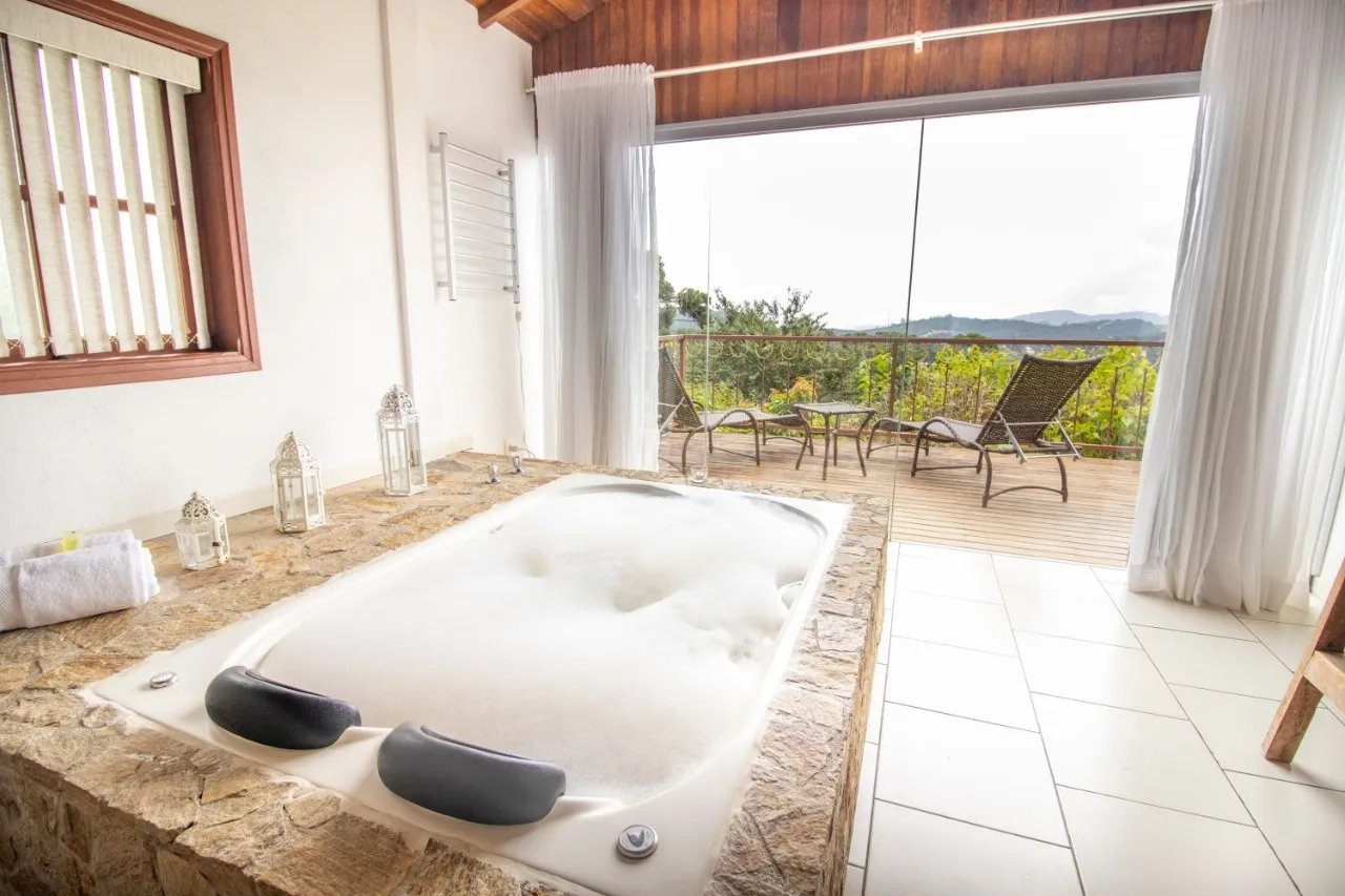 Ar condicionado Secador de cabelo TV a cabo / Smart TV Jacuzzi / Ofurô / Banheira Coberta Frigobar Lareira Máquina de Café Enxoval de Luxo (+ Roupão e Pantufa) Sauna Cozinha Estação de trabalho (mesa e cadeira) Piscina Aquecida ou climatizada Borda Infinita Coberta