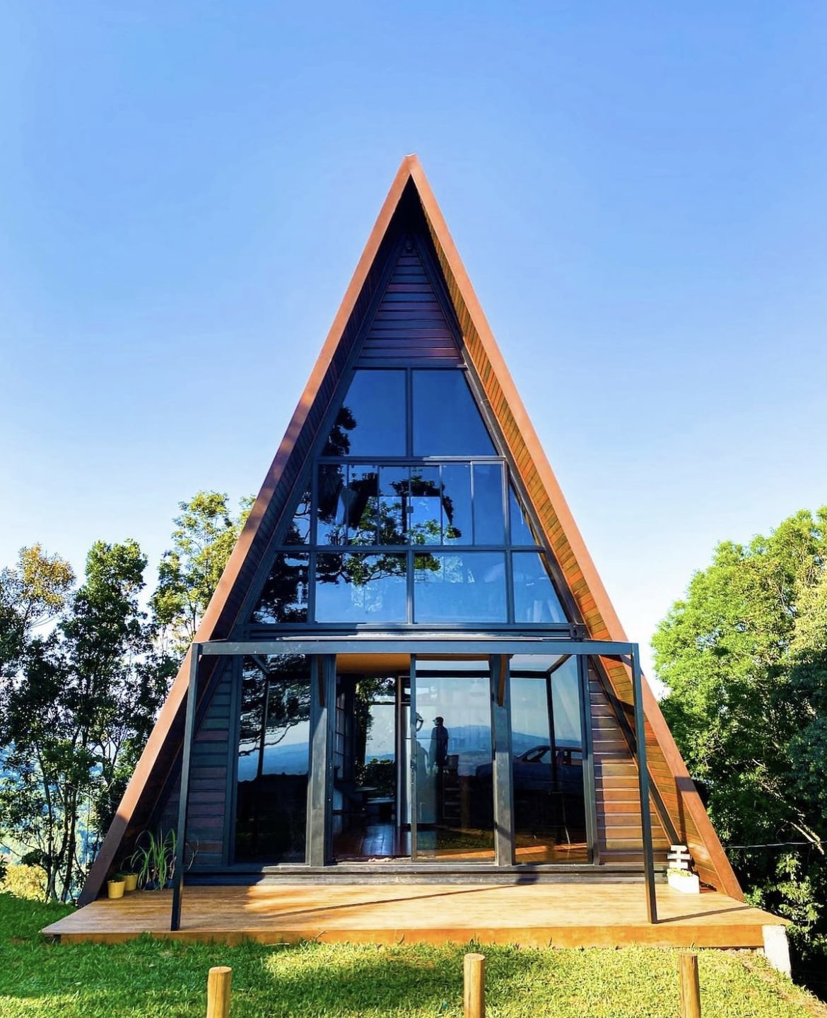 O espaço externo é encantador e compartilhado, proporcionando um ambiente de descanso em meio à natureza, com rede, deck, balanço e namoradeira.