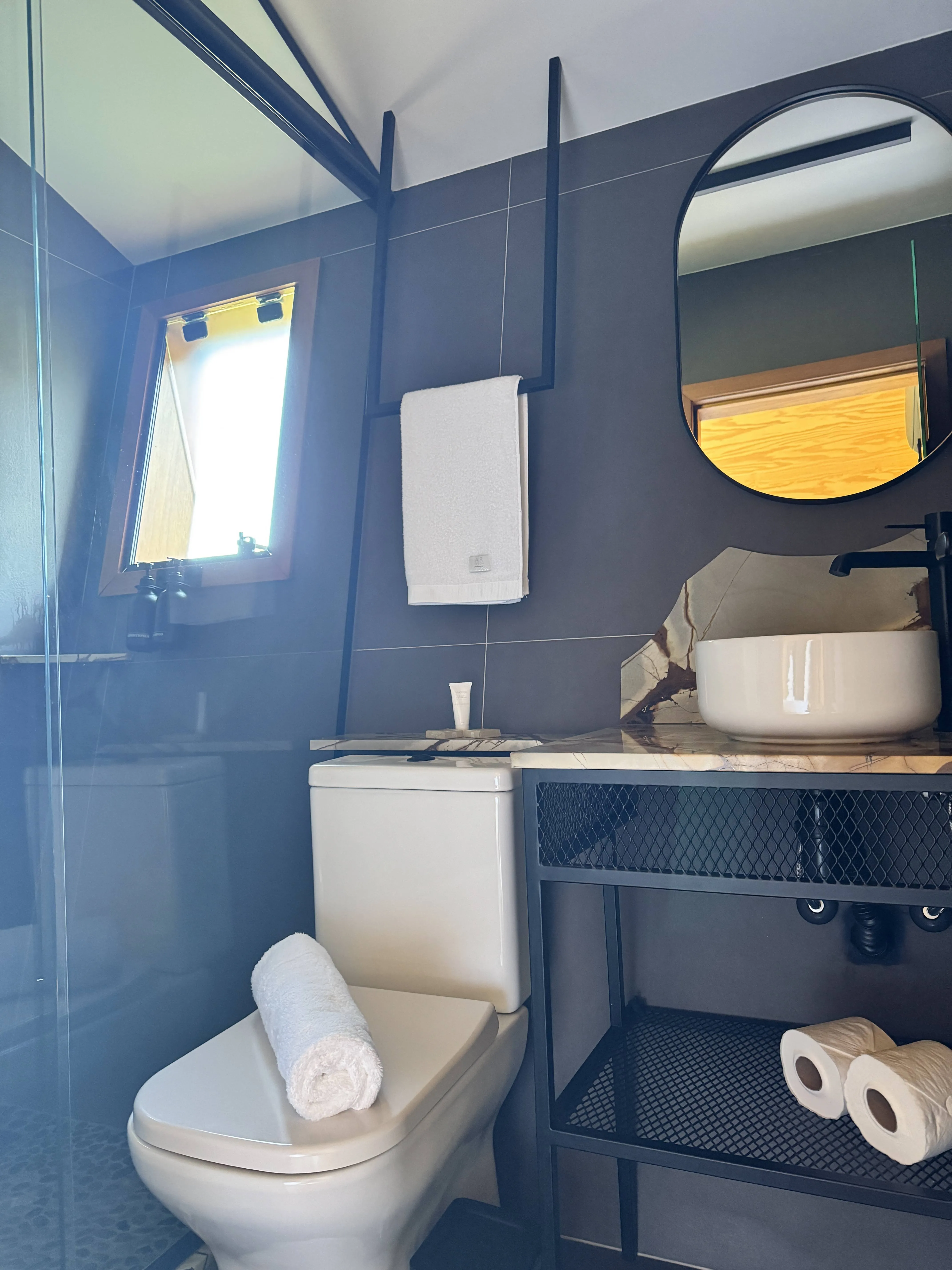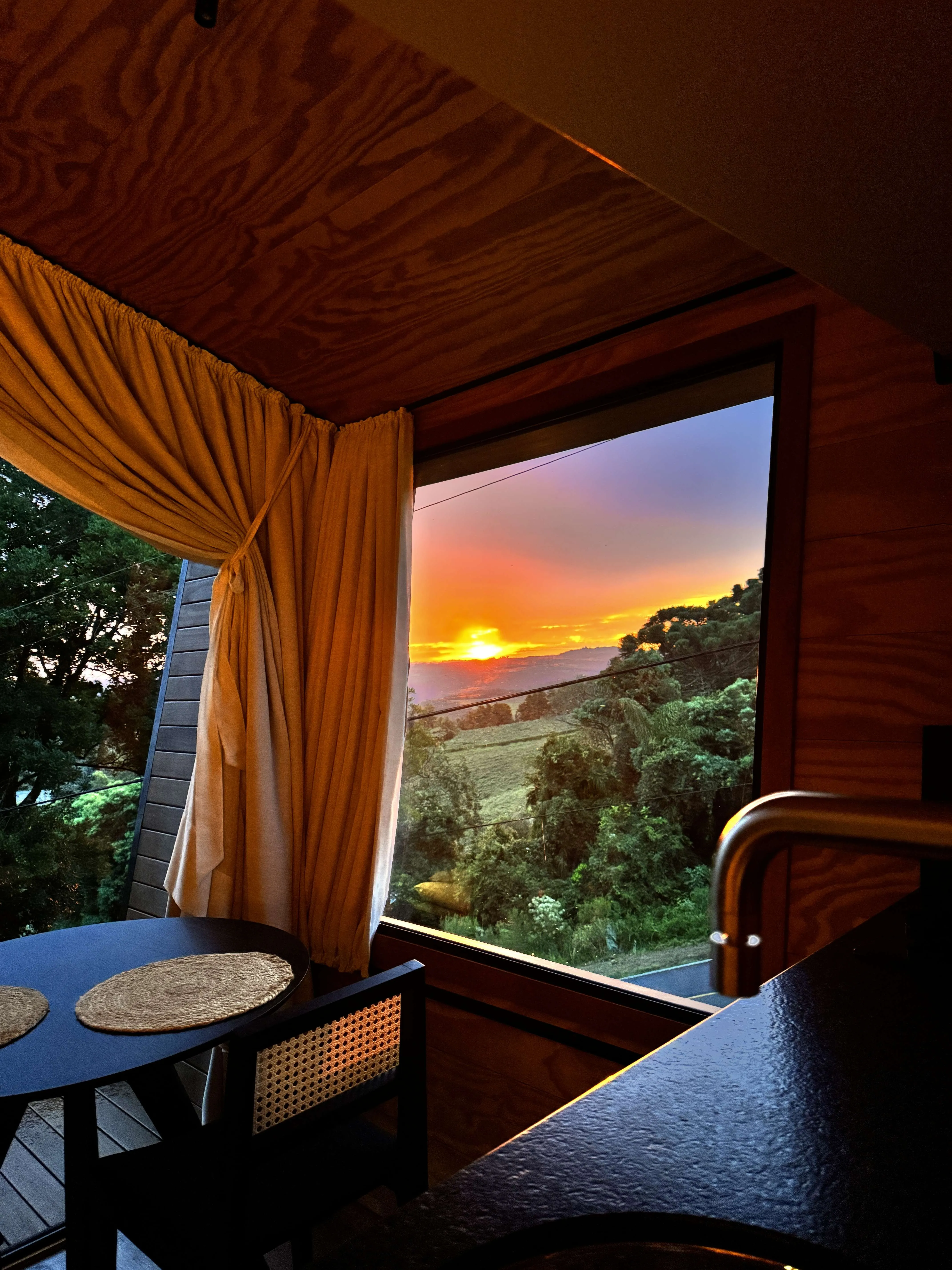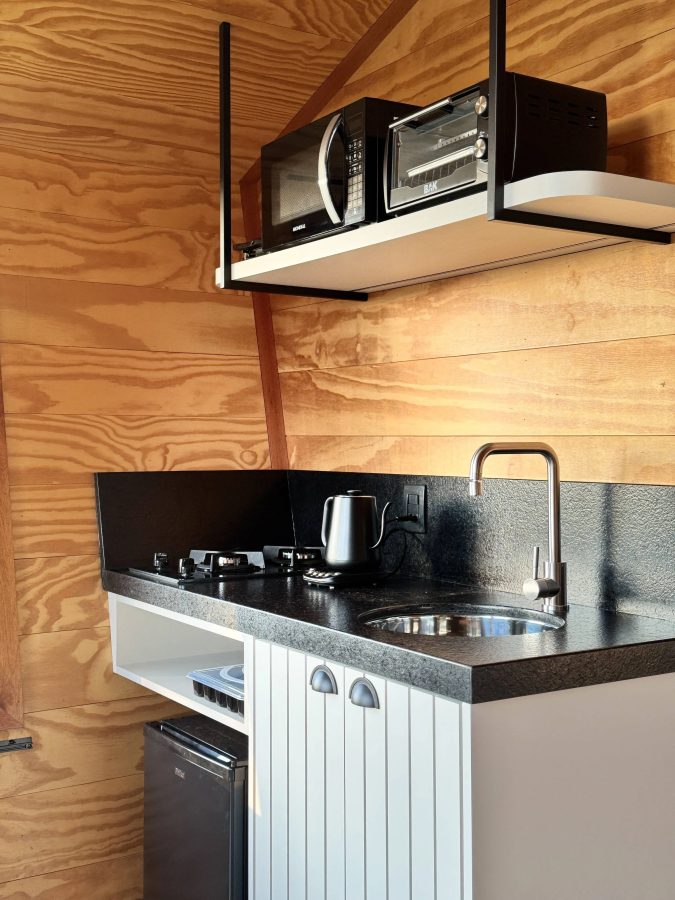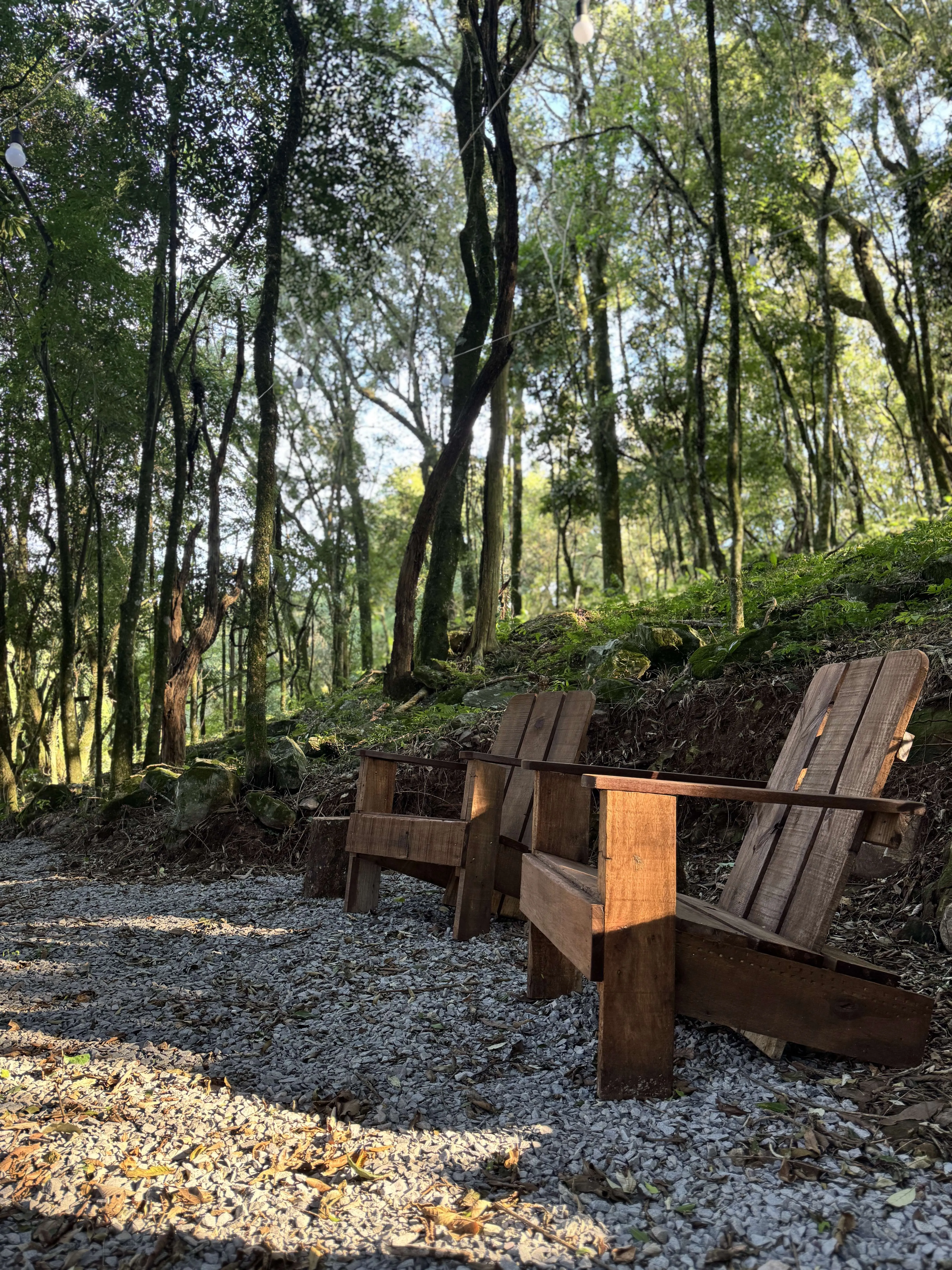 A acomodação dispõe de cama queen size e cozinha completa equipada com fogão, forno elétrico, micro-ondas, torradeira, frigobar, louças e utensílios para o preparo de refeições. Conta ainda com poltronas internas e externas para apreciar a vista de diferentes ângulos, lareira canadense no interior e espaço externo preparado para fogueira, com lenha disponível. O banho proporciona experiência sensorial com aquecimento a gás e piso revestido em pedras, enquanto o ofurô com água aquecida e cromoterapia convida ao relaxamento. A estadia inclui cesta de café da manhã cuidadosamente preparada, com itens selecionados para um início de dia especial.