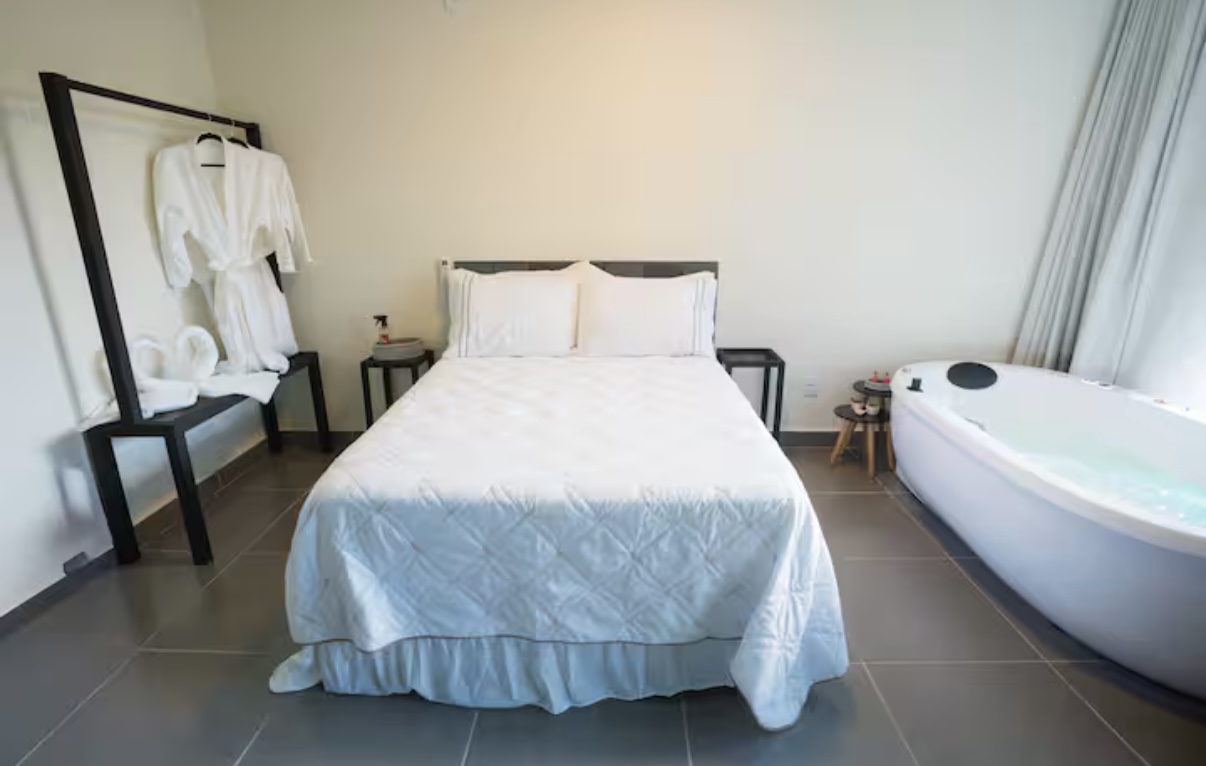 O chalé oferece um ambiente acolhedor, ideal para quem busca tranquilidade em meio à natureza. Com cozinha equipada, lareira, mini churrasqueira e rede suspensa ao ar livre, é o lugar perfeito para apreciar o pôr do sol ou contemplar o céu estrelado em total harmonia com o som natural do ambiente. A banheira com hidromassagem e cromoterapia proporciona ainda mais conforto e relaxamento.