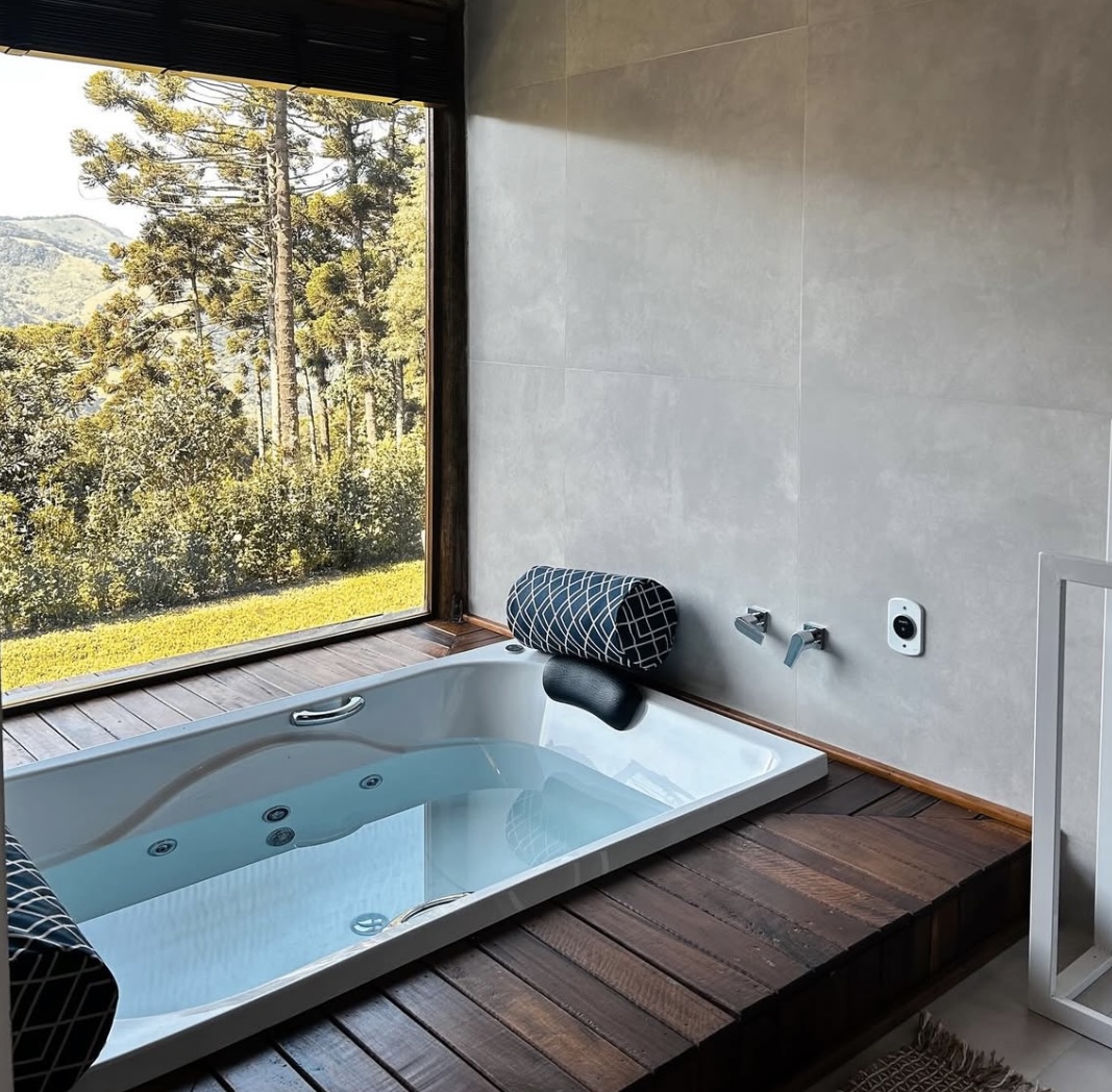 Espaço privativo para casal, cozinha completa, máquina de café, banheira com hidro, lareira ecológica, lareira externa, ar quente e frio, frigobar, roupas de cama, mesa e banho completo .