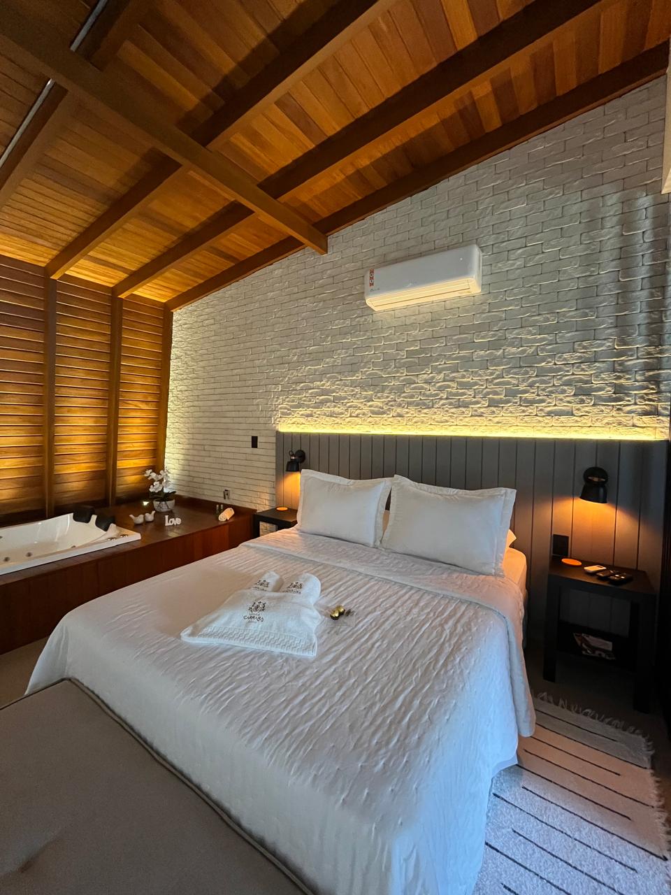 Nosso espaço oferece 4 cabanas de alto padrão, com telhado termoacústico, recém inauguradas e finamente decoradas, todas com banheira de hidromassagem dupla e cromoterapia, cama queen size, enxoval completo, amenities de extrema qualidade, espuma de banho, roupões, TV Smart 32” com Netflix, Wi-Fi, ar condicionado quente e frio, torneiras com água aquecida, secador de cabelo, lareira externa, fechadura eletrônica.