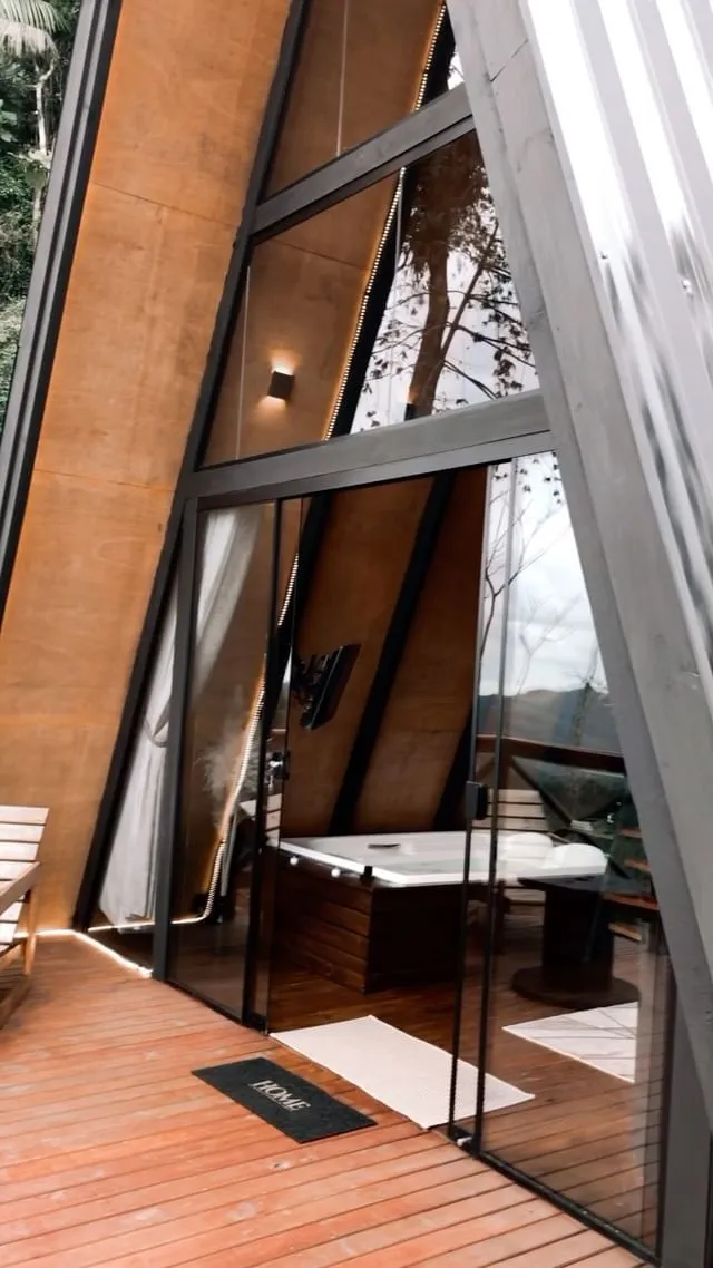 A cabana em estilo A-frame foi construída com materiais da região e dispõe de cozinha completa, sala de estar com lareira a combustão, banheira de hidromassagem com vista para o vale e deck privativo com panorama aberto, que em dias claros permite avistar o mar. Cada detalhe foi pensado para oferecer uma experiência intimista, sofisticada e memorável em meio à natureza.