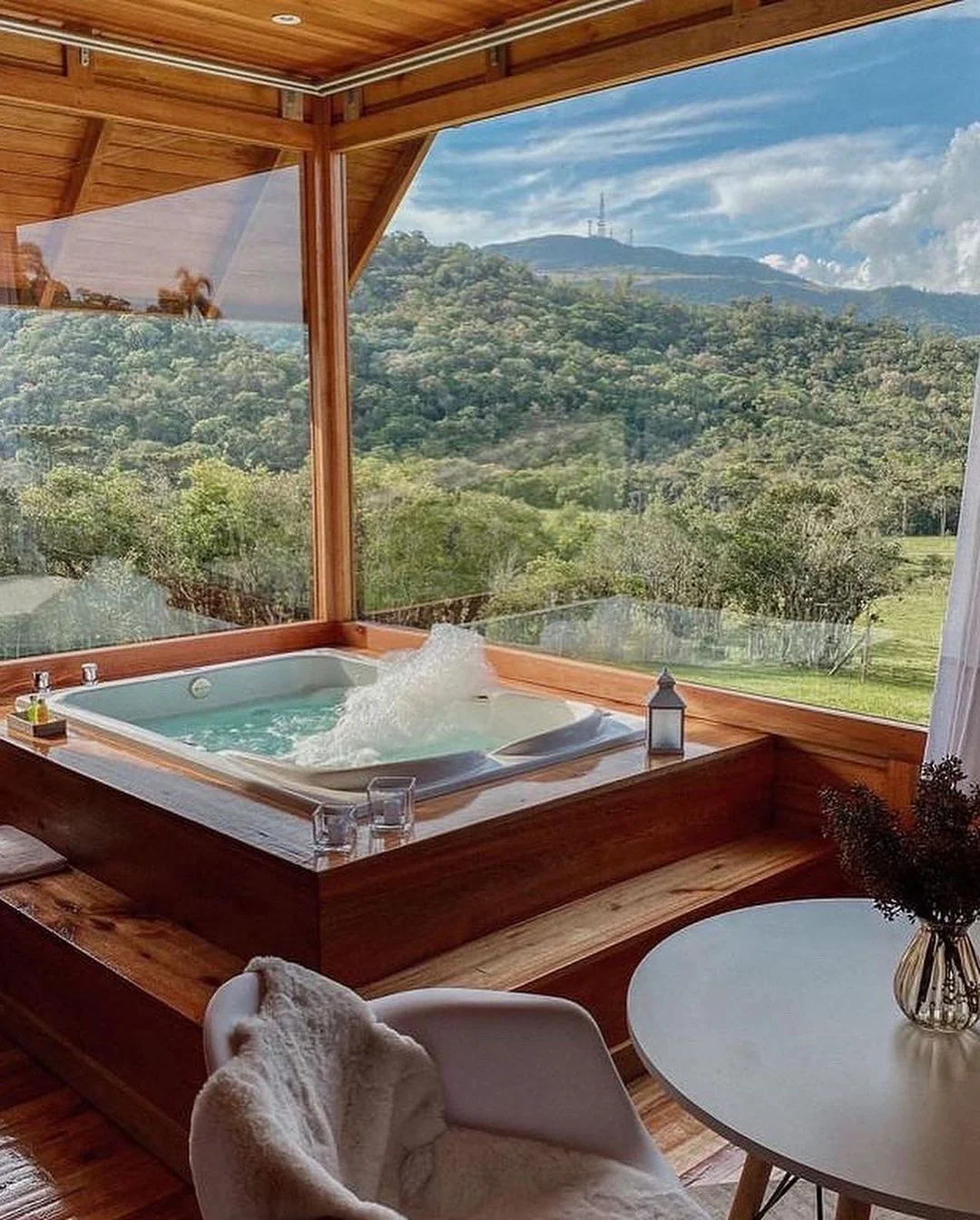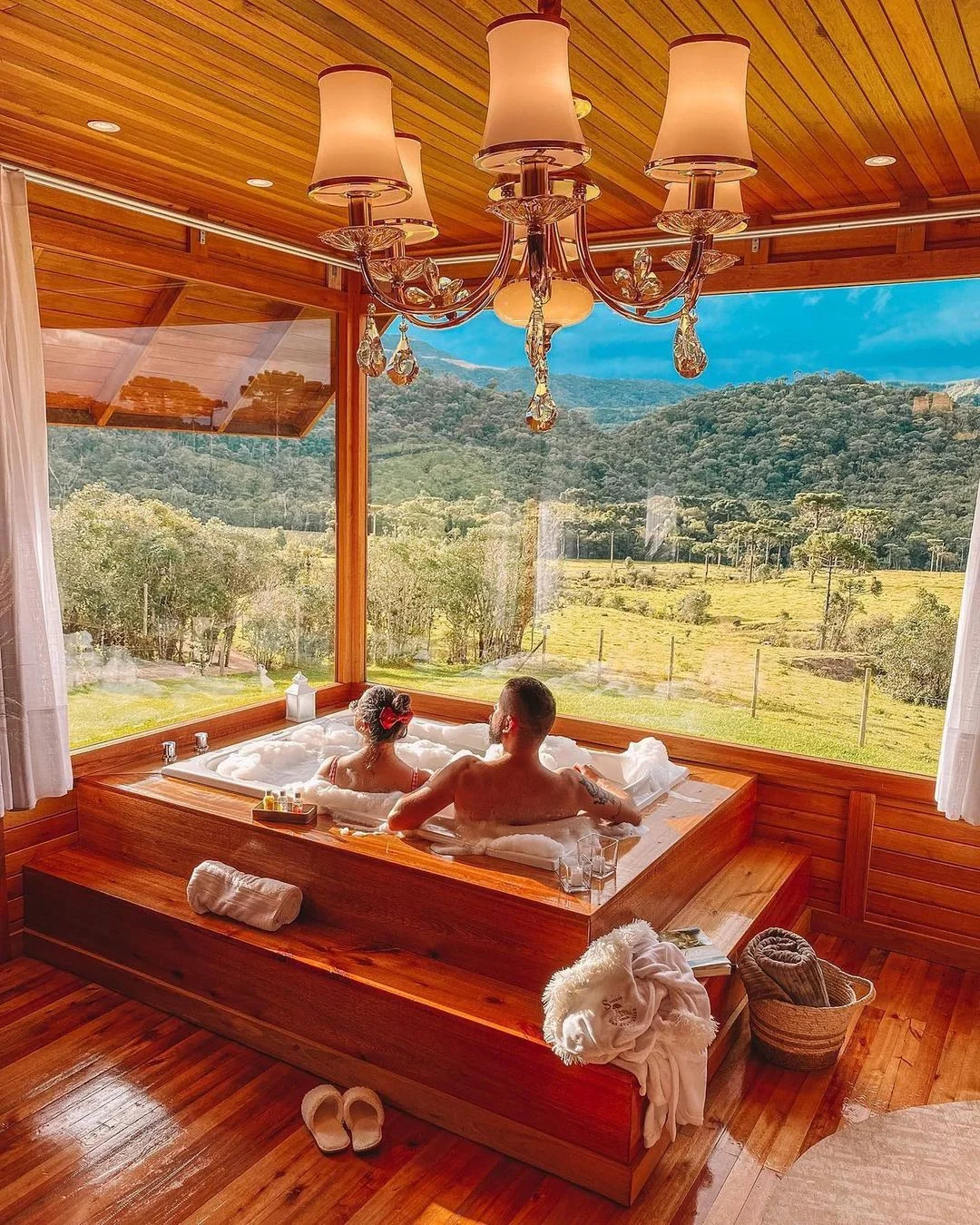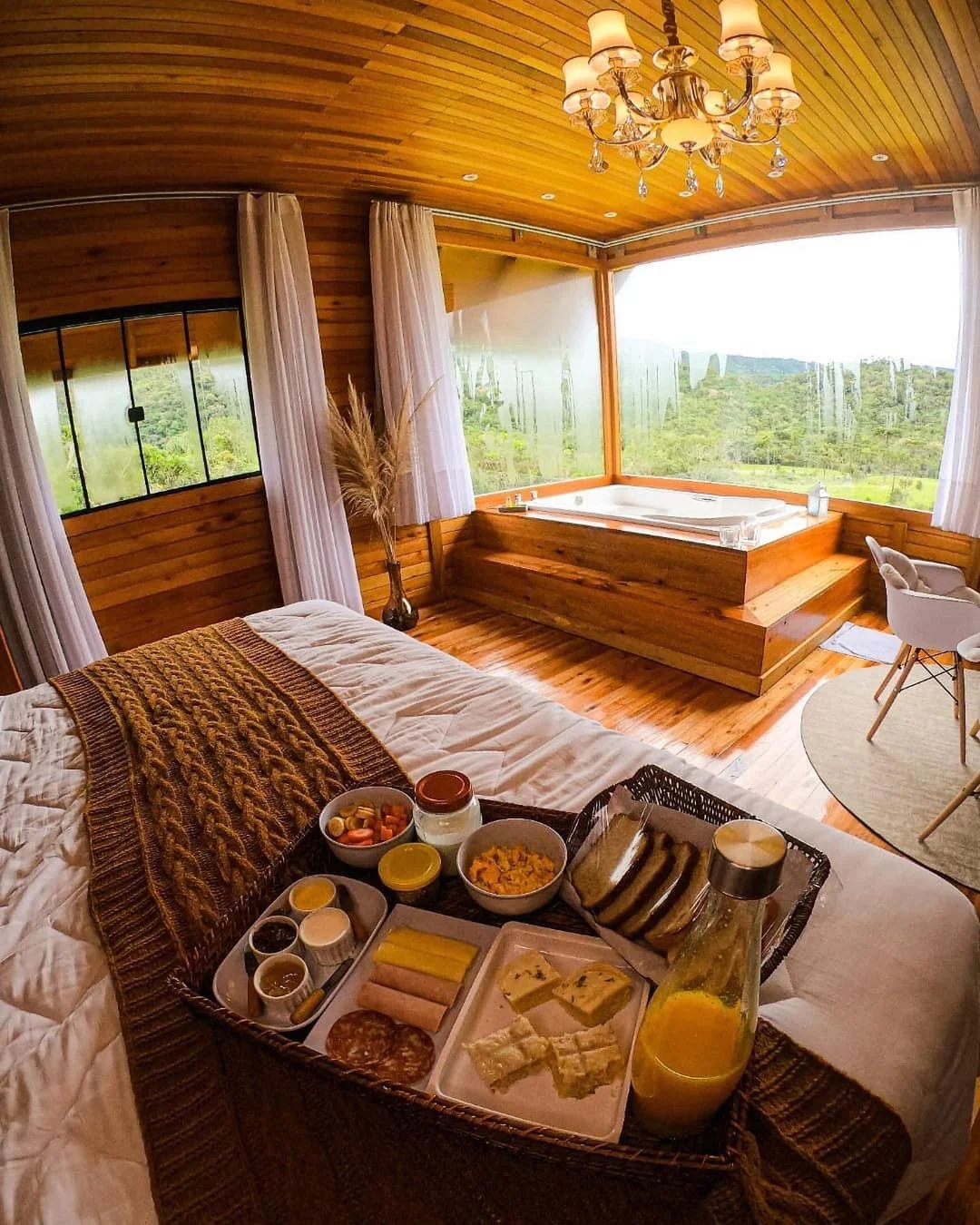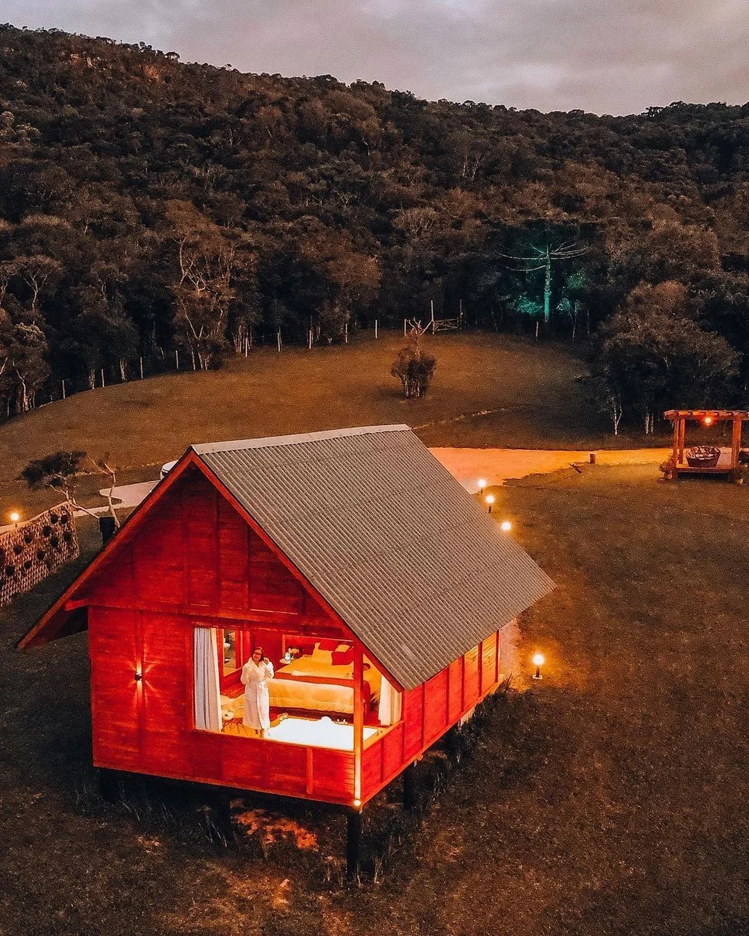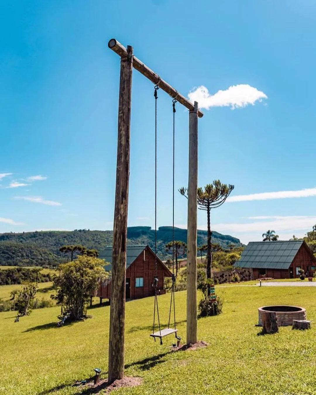 As cabanas são equipadas com: ar-condicionado, TV a cabo, wi-fi, roupas de cama, toalhas de banho, banheira de hidromassagem, cozinha completa, café da manhã, chuveiro à gás, lareira interna, deck externo, gazebo, fogo de chão e balanço do infinito.