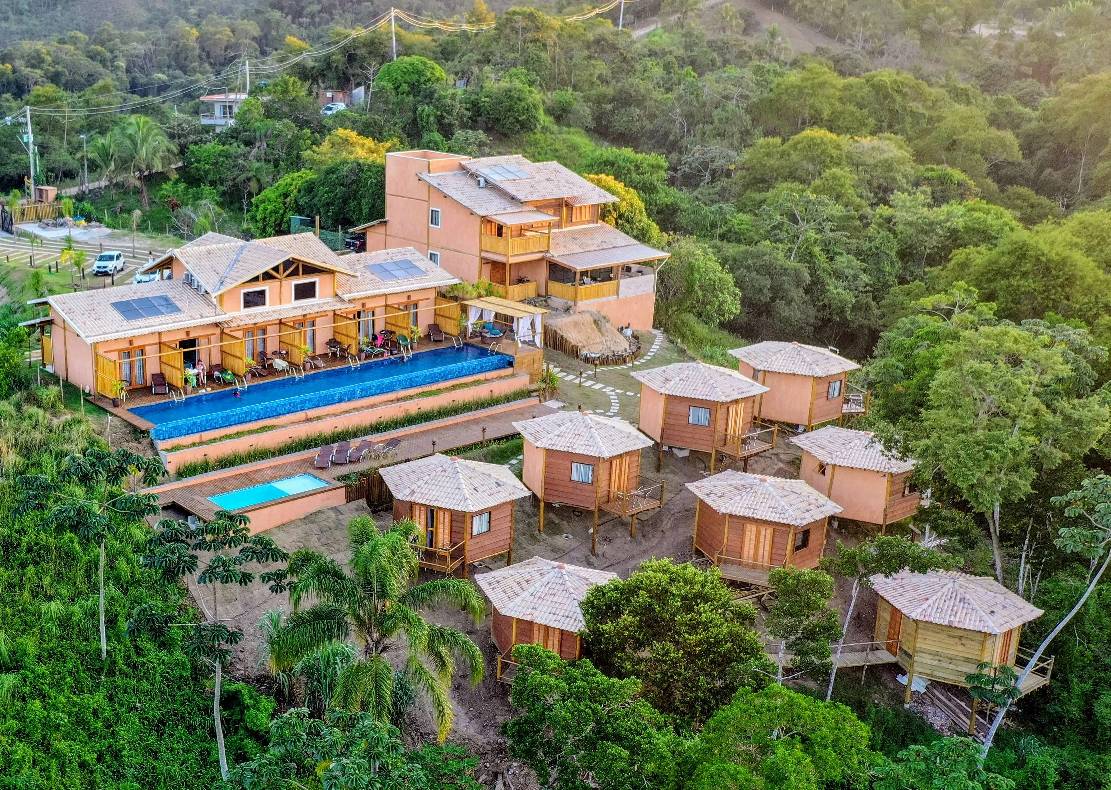 Os bangalôs acomodam até 4 pessoas com todo o conforto e praticidade. Cada unidade é equipada com uma TV de 50 polegadas, frigobar, ar-condicionado, secador de cabelo, roupas de cama e banho, além de toalhas para a piscina.
