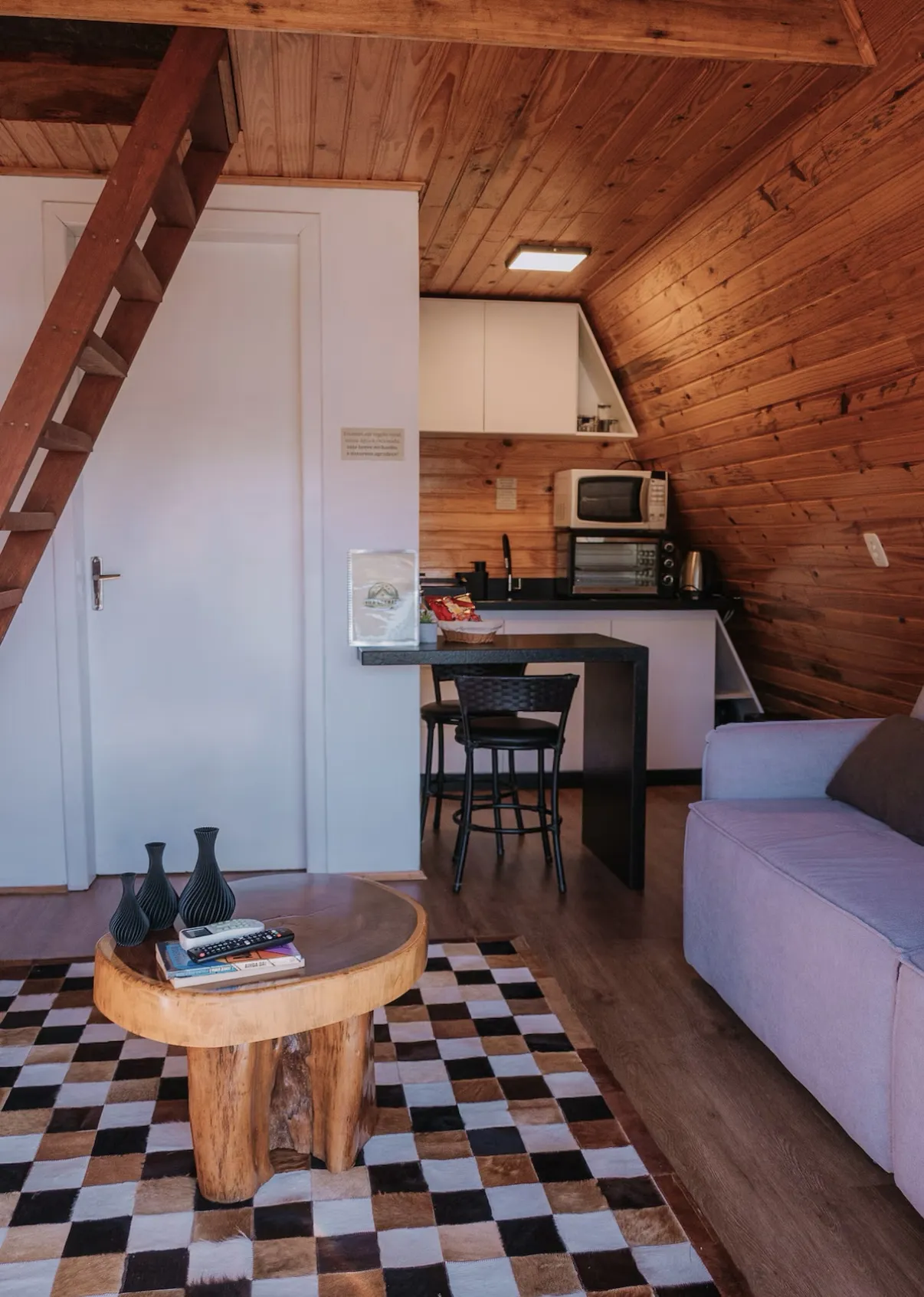 Refúgio acolhedor em Gramado que une charme, conforto e contato direto com a natureza. As acomodações oferecem lareira para noites aconchegantes, sala de estar charmosa com sofá e TV, além de mini cozinha equipada com fogão por indução, frigobar, micro-ondas e utensílios, garantindo praticidade durante a estadia. Na área externa, um quiosque exclusivo com churrasqueira e espaços de lazer convida a momentos especiais ao ar livre.