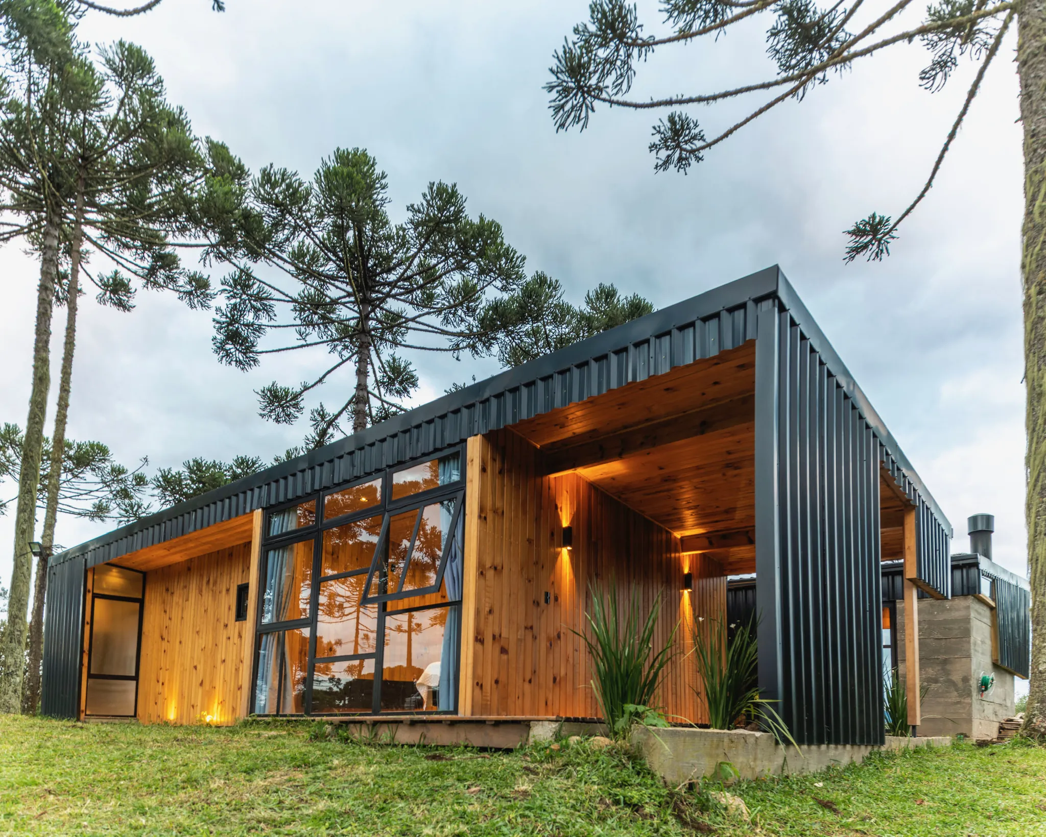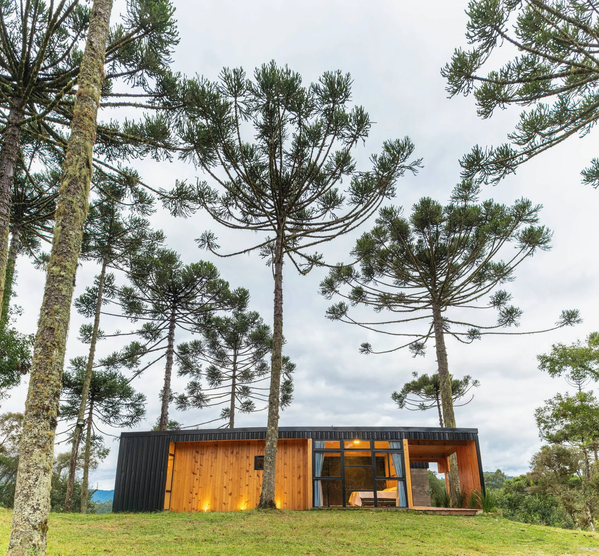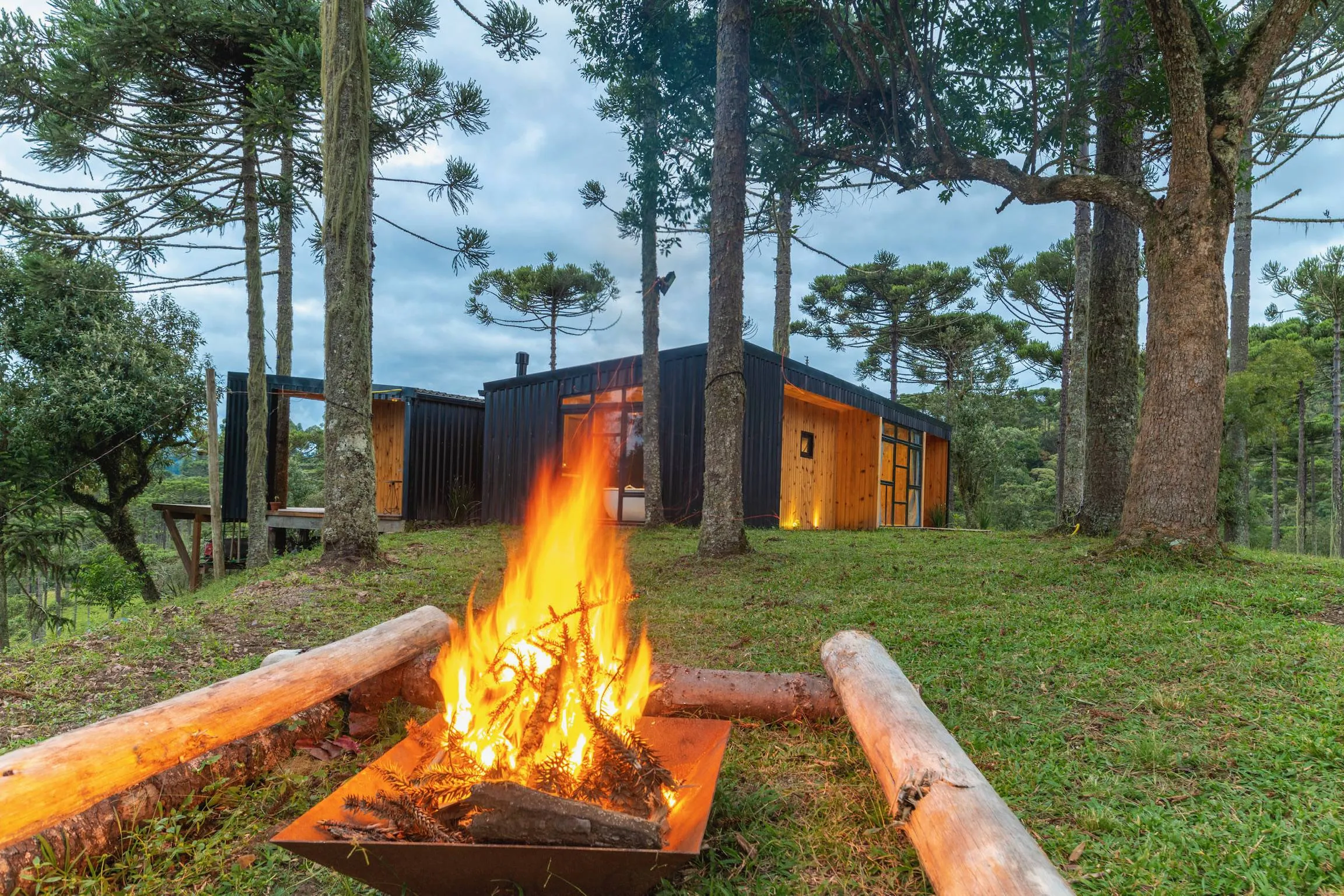 Já a Casa Araucária é ideal para famílias ou grupos de amigos que desejam conforto aliado à natureza. Com capacidade para até quatro pessoas, conta com suíte equipada com cama queen, quarto com duas camas de solteiro, lareira, ampla sala e cozinha completa. O espaço oferece banheira de imersão, sofá para até cinco pessoas, churrasqueira e um amplo deck com fogo no chão, perfeito para reunir e criar memórias especiais.