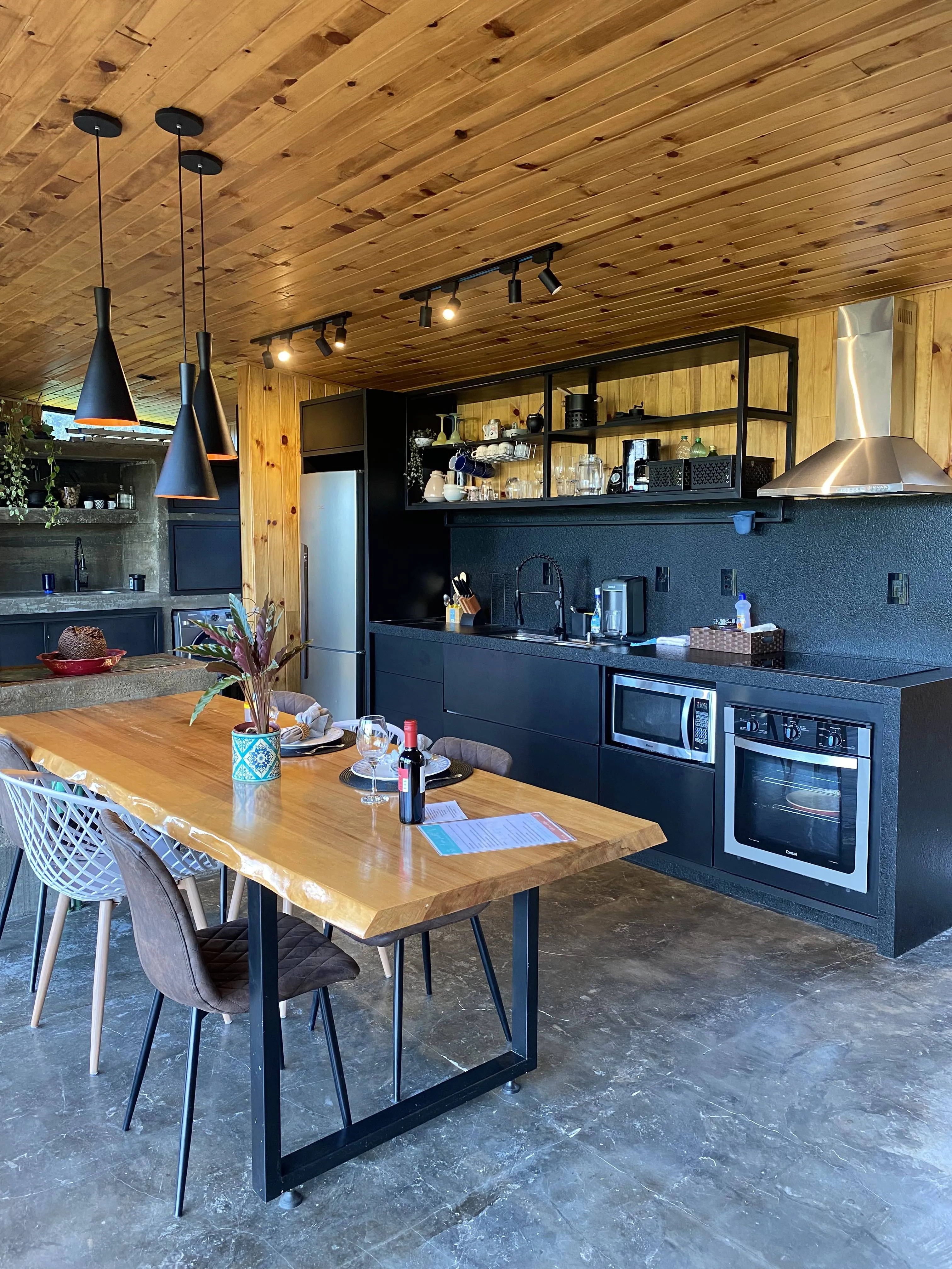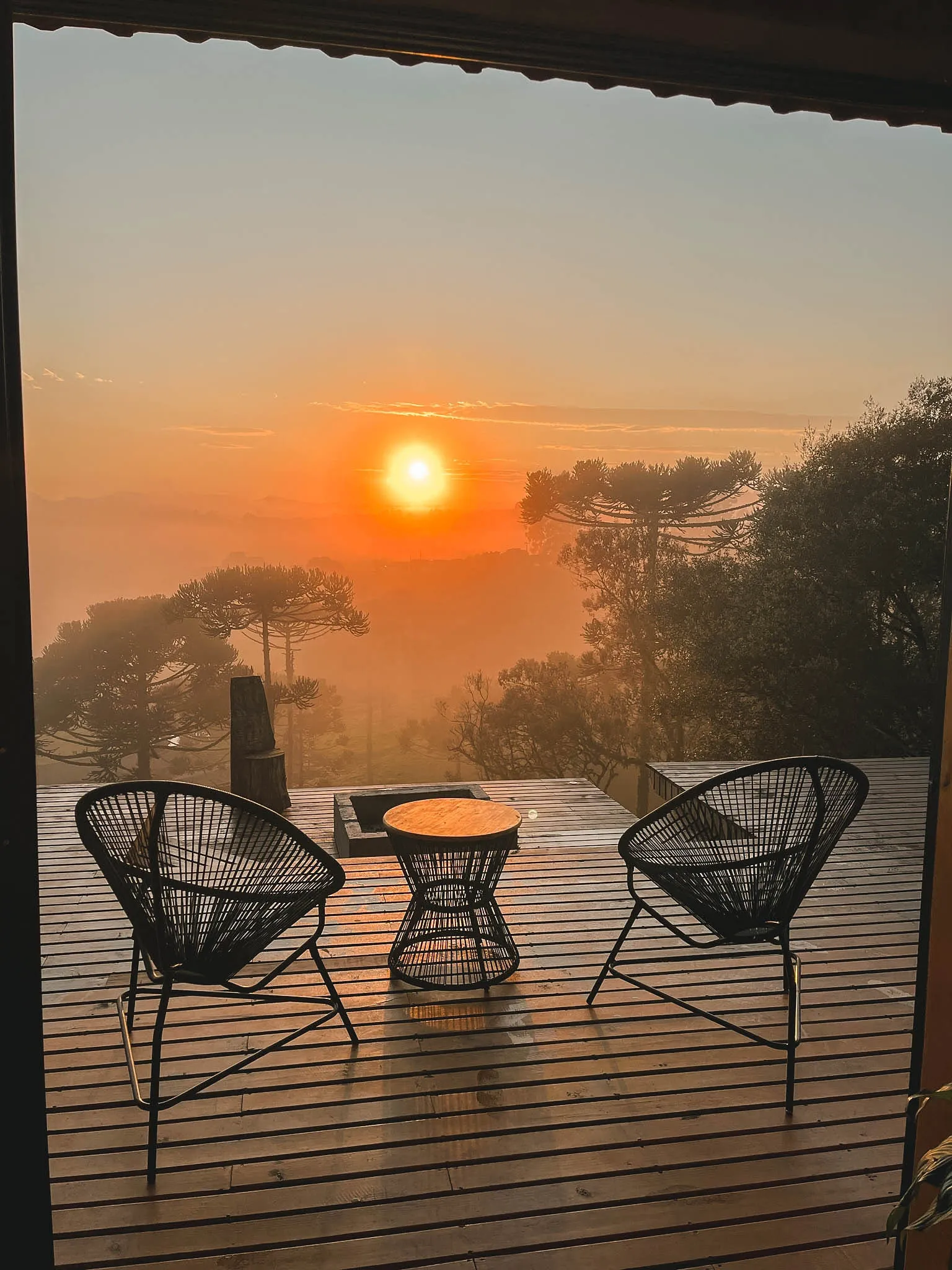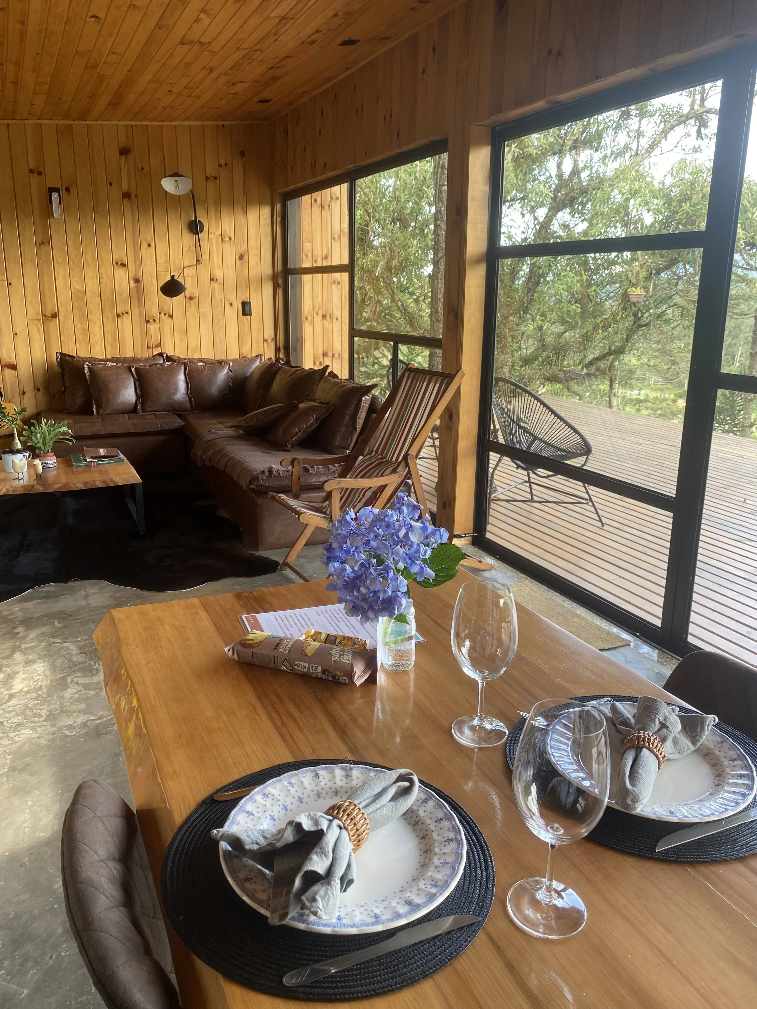 Já a Casa Araucária é ideal para famílias ou grupos de amigos que desejam conforto aliado à natureza. Com capacidade para até quatro pessoas, conta com suíte equipada com cama queen, quarto com duas camas de solteiro, lareira, ampla sala e cozinha completa. O espaço oferece banheira de imersão, sofá para até cinco pessoas, churrasqueira e um amplo deck com fogo no chão, perfeito para reunir e criar memórias especiais.