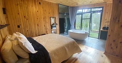 Em meio às belezas da Serra Catarinense, o refúgio oferece duas opções exclusivas para uma estadia inesquecível. A Cabana Romântica foi criada para casais que buscam momentos de conexão e tranquilidade, com cama queen voltada para araucárias, banheira de imersão e praça de fogo de chão. O ambiente compacto, mas sofisticado, dispõe de cozinha equipada, ar-condicionado, calefator e detalhes que garantem aconchego em todas as estações.